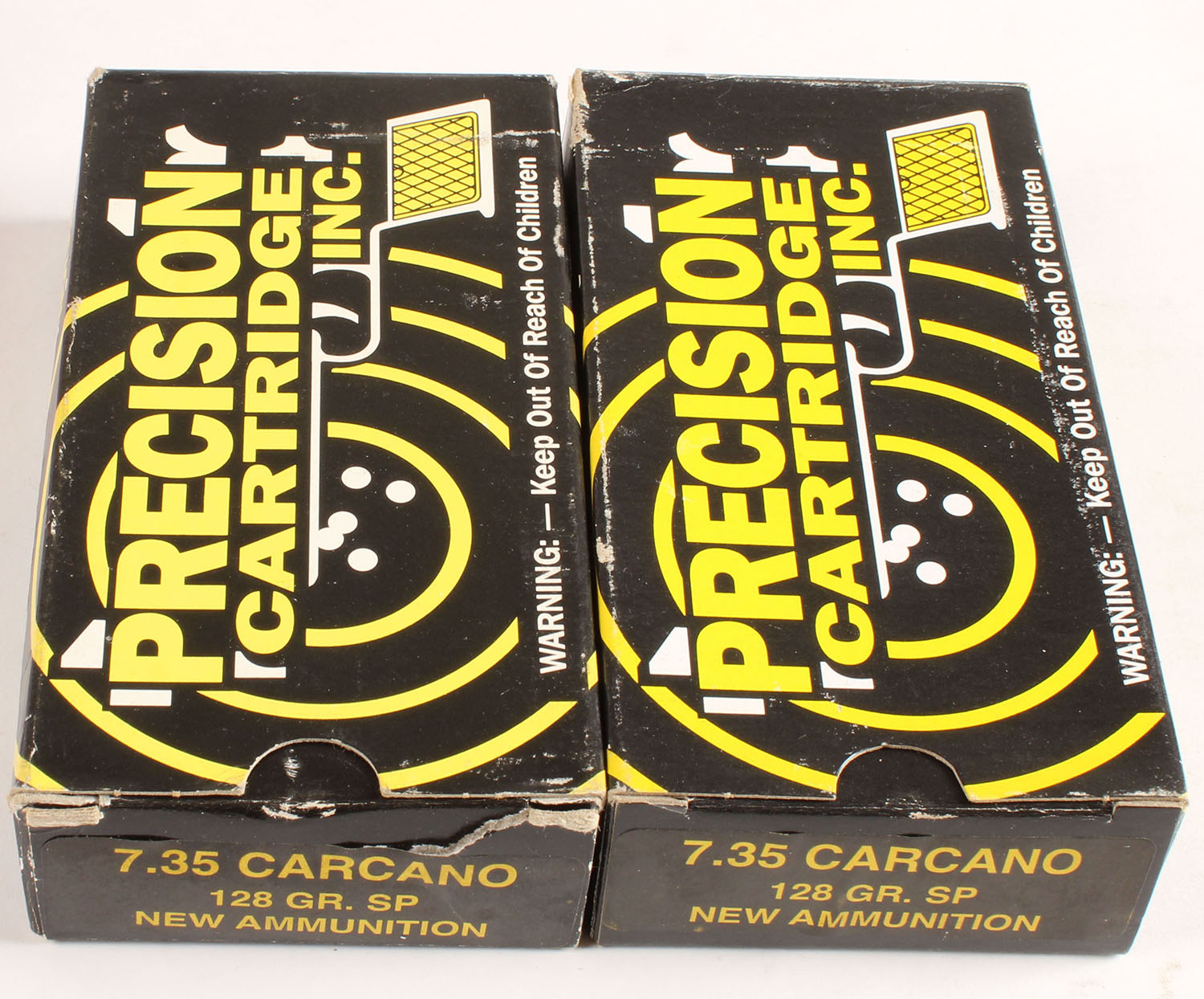 Precision Cartridge Inc., Lot of 2, 7.35 Carcano, 128 Gr. SP, 1pc, Full, black box with yellow/white print, box is solid with excellent color, light rub marks, ammo is very good. Grade: Very Good ++ - Value: 40 to 100