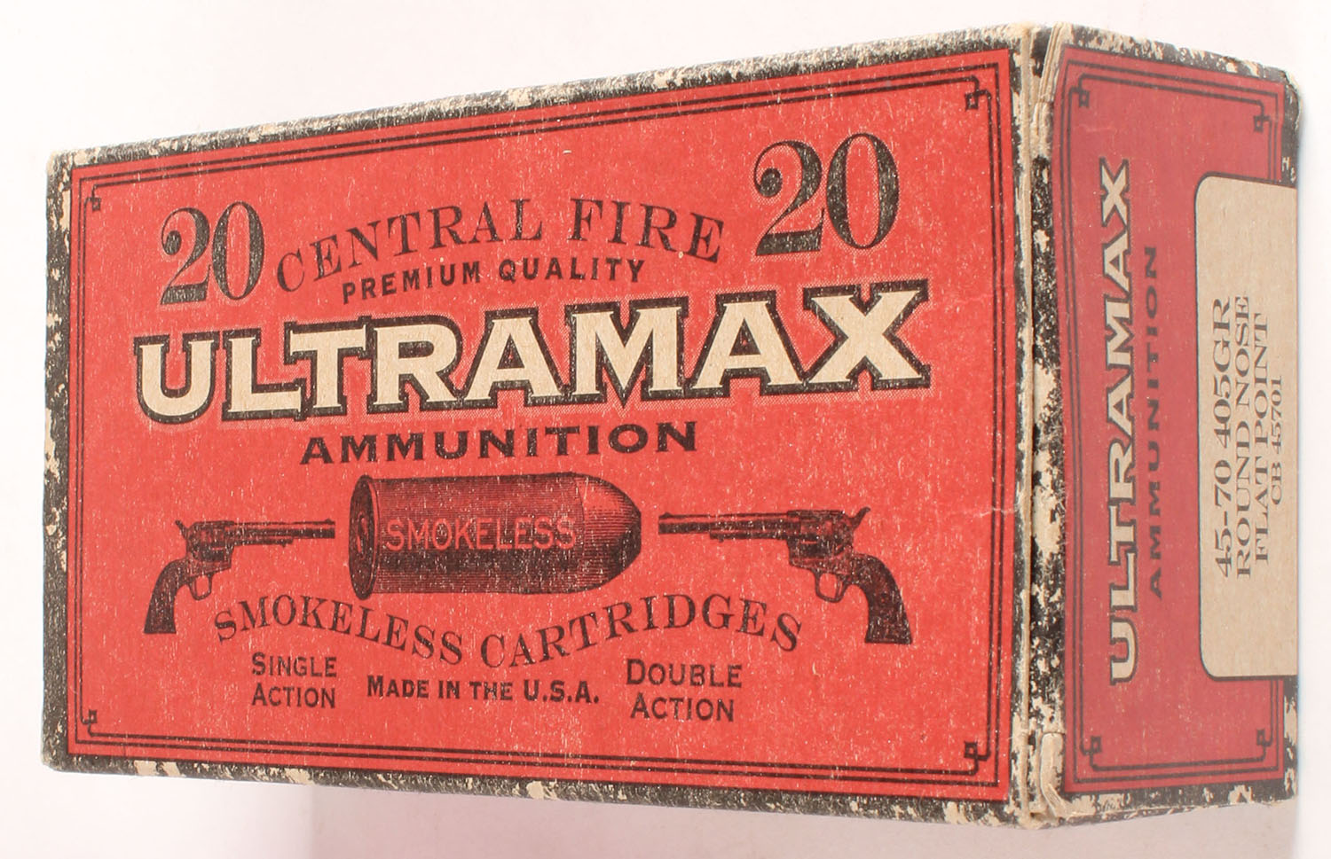 Ultramax, .45-70, 405 Gr., Round Nose-FP, 1pc, Full, black/red box with black/white print, box is solid with excellent color very minor age soiling, end flaps are solid, ammo is minty. Grade: Excellent - Value: 30 to 80