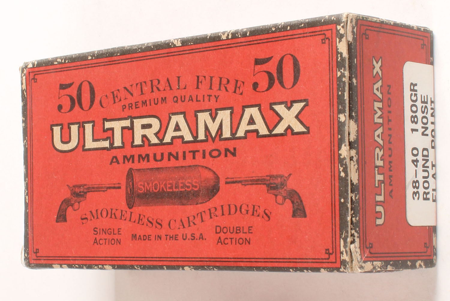 Ultramax, .38-40, 180 Gr., Round Nose-FP, 1pc, Full, black/red box with black/white print, box is very solid with excellent color, edges are crisp, end flaps are solid, ammo is very good. Grade: Excellent - Value: 30 to 80