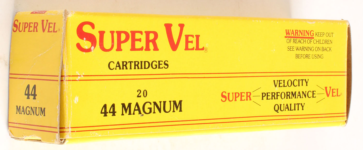 Super Vel, .44 Magnum, 180 Gr. JHP, 1pc, Full, yellow box with red/black print, box is solid with excellent color, ammo is excellent. Grade: Excellent + - Value: 20 to 40