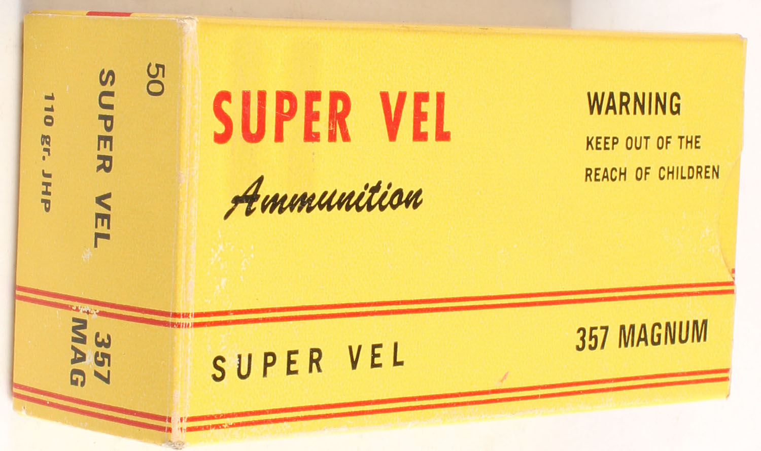 Super-Vel, .357 mag, 110 Grain JHP, Full, 1pc. multi-colored box, box is solid with excellent color, Ammo is excellent. Grade: Excellent ++ - Value: 20 to 60