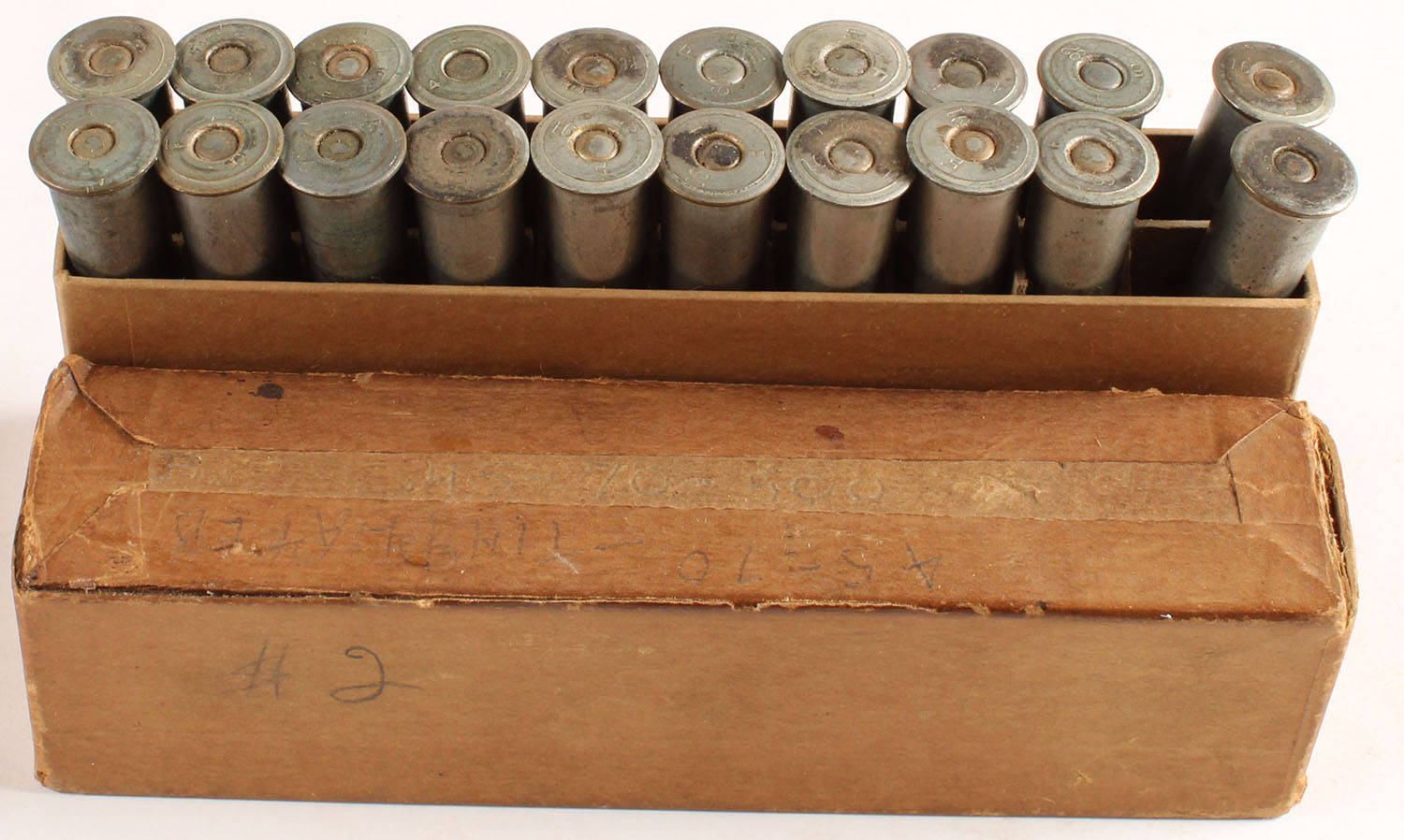 Unknown Mfg., 45-70, Full, 2pc. Buff box with no label, box is solid with seam splits, ammo is good. Grade: Good ++ - Value: 10 to 50