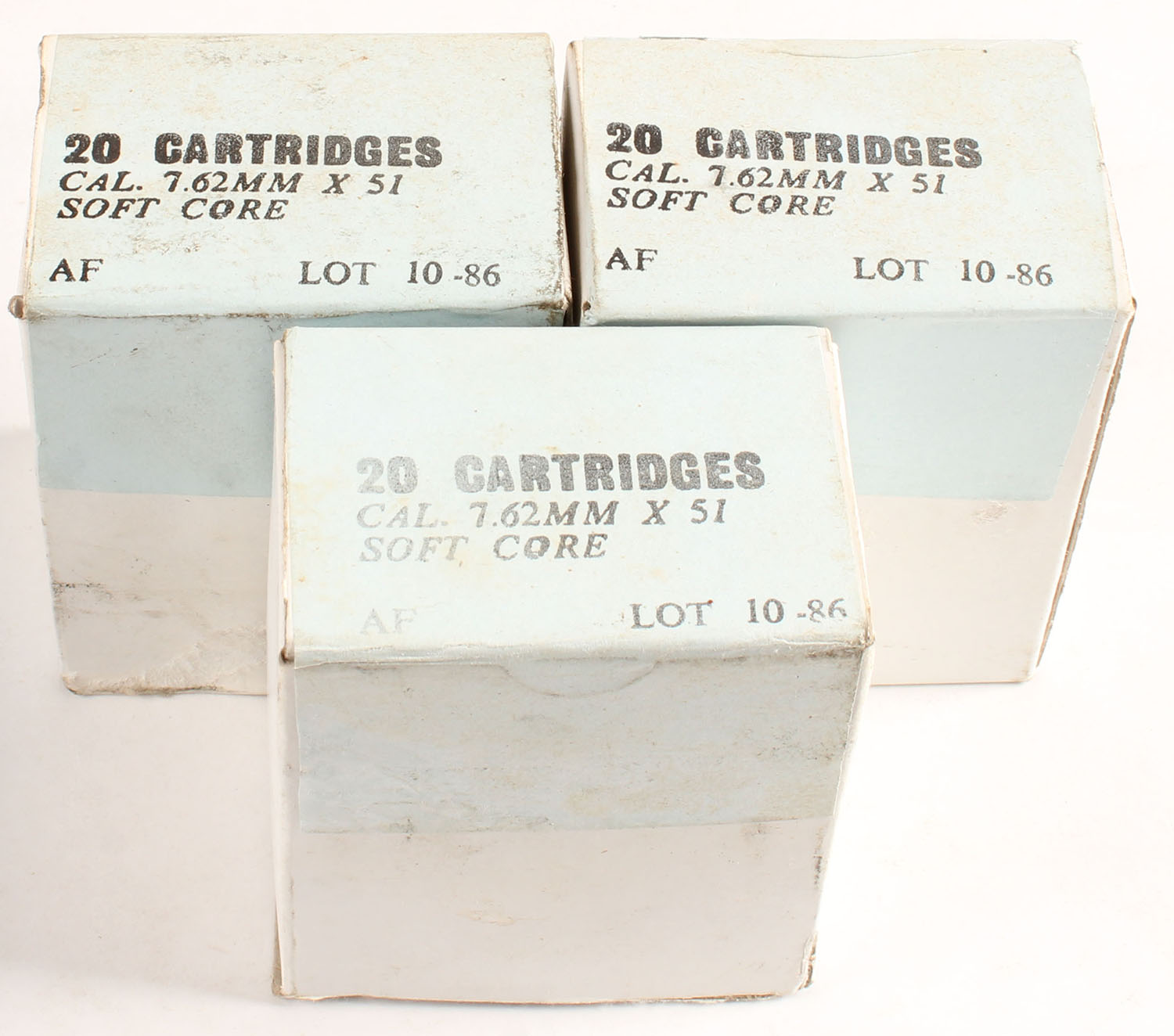 Nigerian, Lot of 3, 7.62MM x 51, Soft Core, Full, 1pc. Boxes are very solid, white boxes with blue label, ammo is excellent. Grade: Very Good ++ - Value: 30 to 90