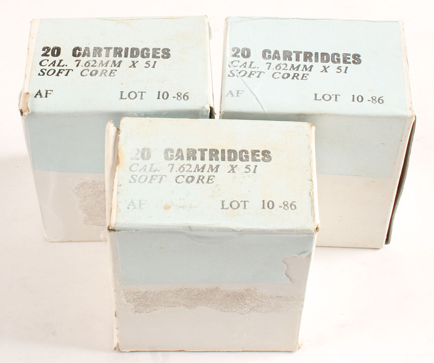 Nigerian, Lot of 3, 7.62MM x 51, Soft Core, Full, 1pc. Boxes are very solid, white boxes with blue label, ammo is excellent. Grade: Very Good ++ - Value: 30 to 90