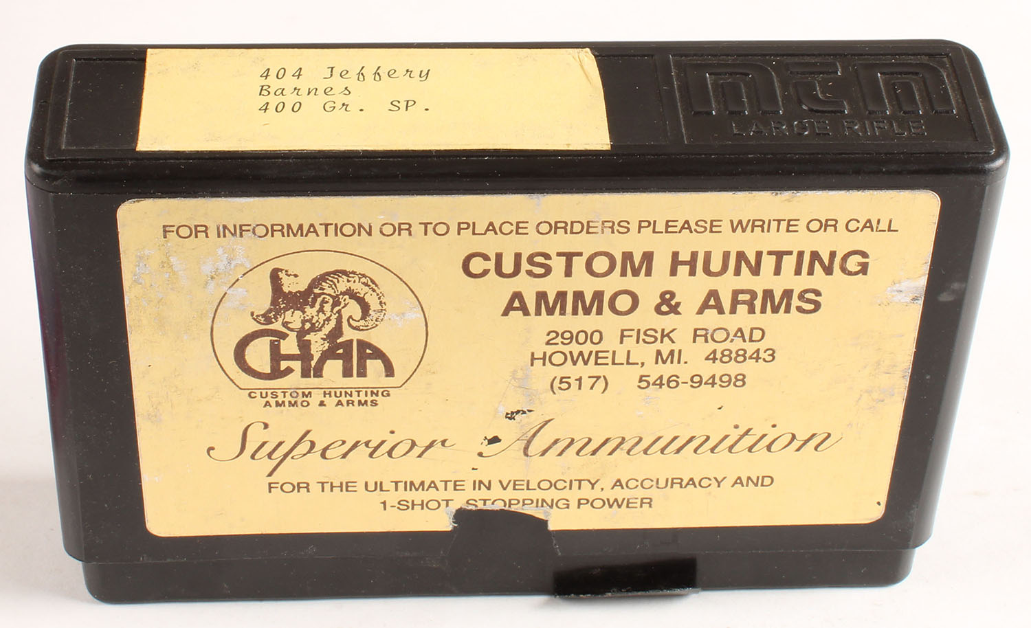 CHAA, Superior Ammunition, .404 Jeffery Barnes, 400 Gr., 2pc, Full, Black plastic box with gold color labels, box is very solid with light rub marks, ammo is excellent. Grade: Very Good ++ - Value: 20 to 80