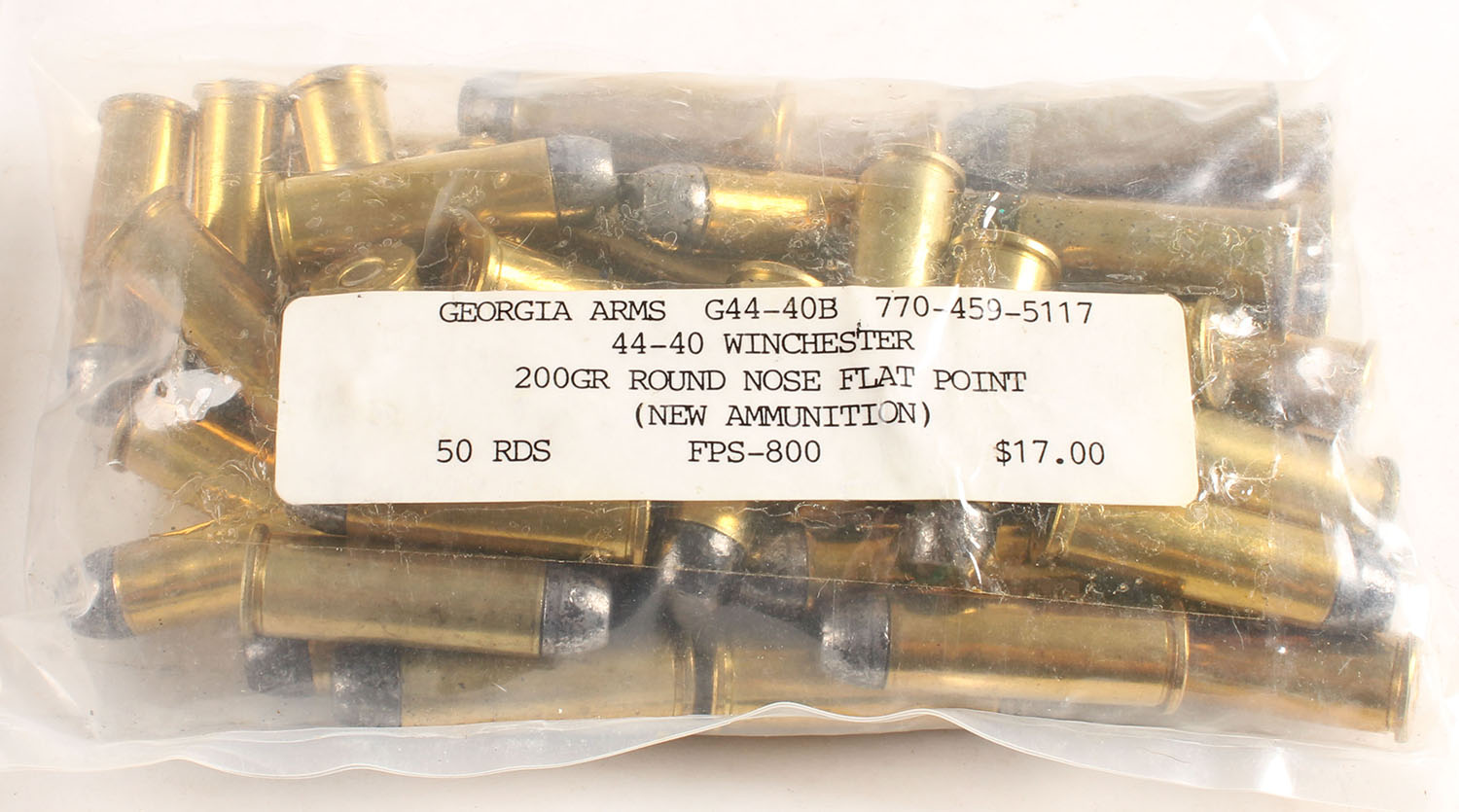 Georgia Arms, 44-40 Winchester, 200 Gr. Round Nose Flat Point, Full 50 Rds. 1pc. Ammo is in sealed plastic bag, ammo is excellent. Grade: Excellent - Value: 10 to 100