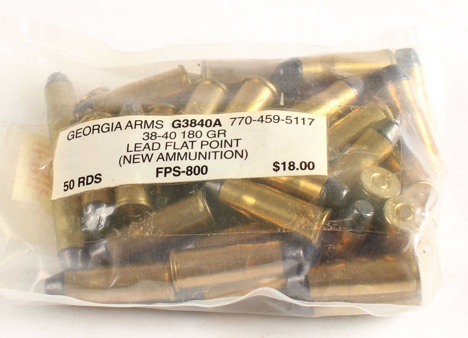 Georgia Arms, 38-40, 180 Gr. Lead Flat Point, Full 50 Rds. 1pc. Ammo is in sealed plastic bag, ammo is excellent. Grade: Excellent - Value: 10 to 100