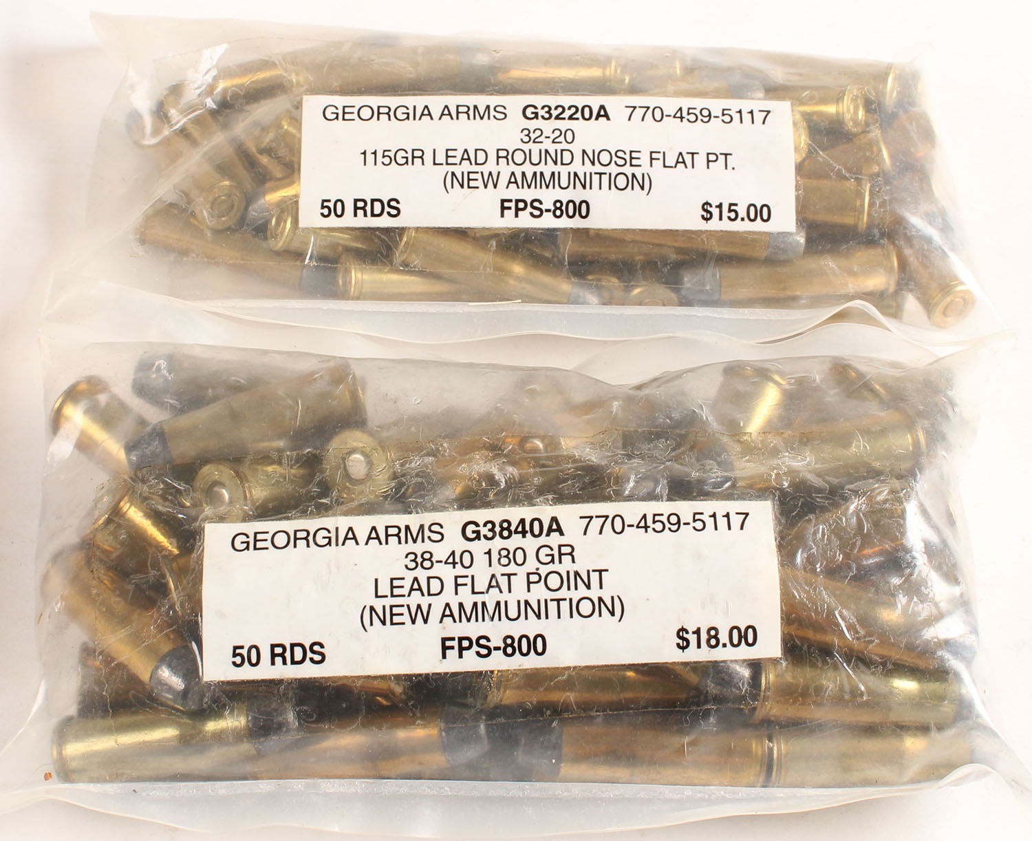 Georgia Arms, Lot of 2, 38-40 180 Gr. Lead Flat Point & 32-20 115 Gr. Lead Round Nose Flat PT, Full 100 rds. Ammo is in sealed plastic bags, ammo is very good. Grade: Very Good + - Value: 20 to 100