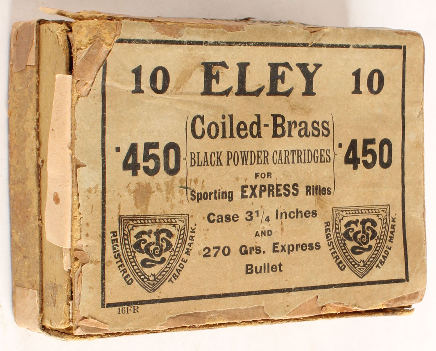 Eley Bros., Coiled-Brass, .450, 270 Gr. Express Bullet, Full, 2pc. Buff box with green label, box has torn lid to top, age soiling, some shelf wear, edge & corner wear, label is 80% intact, ammo is very good. Grade: Very Good - Value: 10 to 100