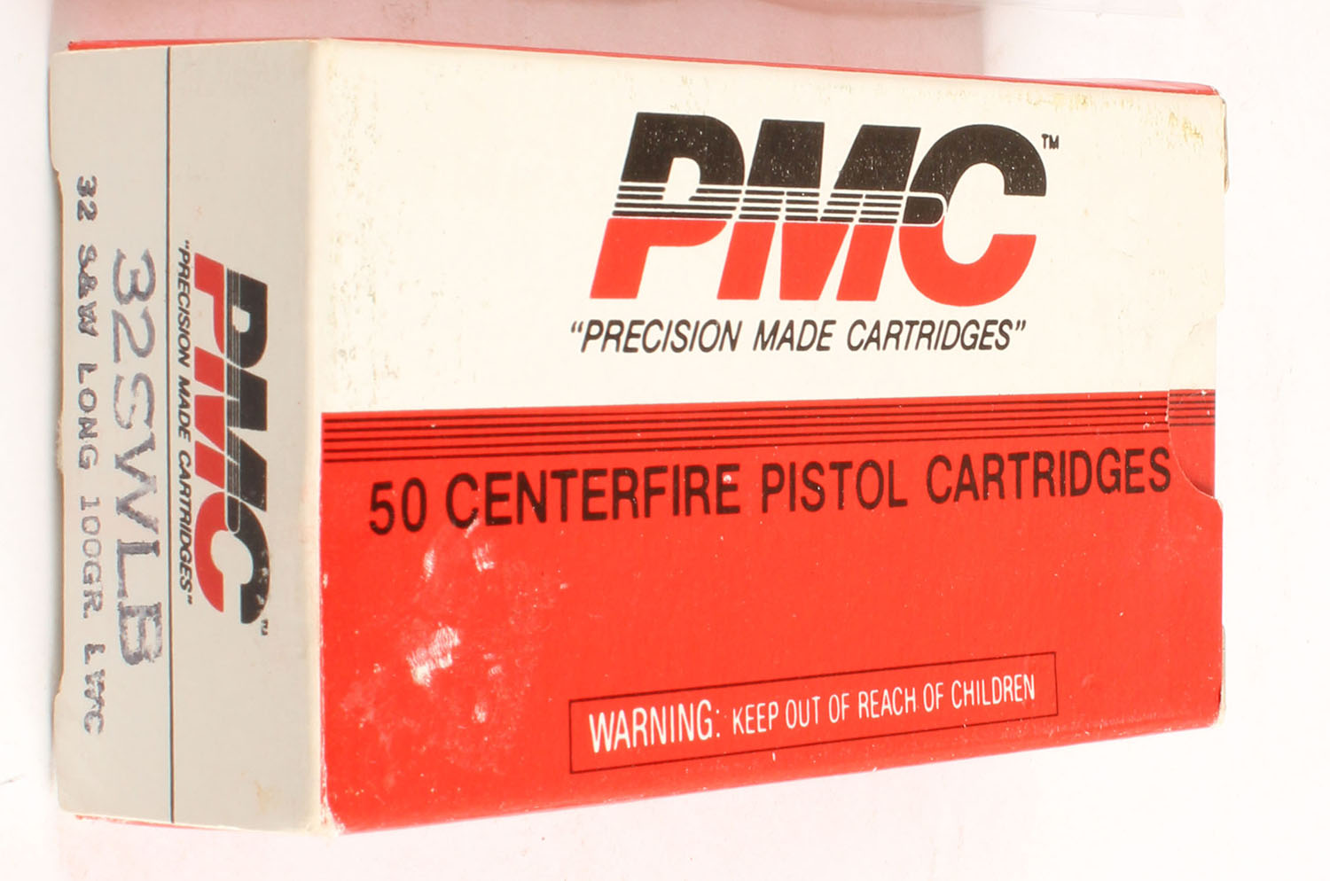PMC, .32 S&W Long, 100 Gr., 1pc, Full, white & red box with black print, box is solid, ammo is excellent. Grade: Excellent + - Value: 10 to 40