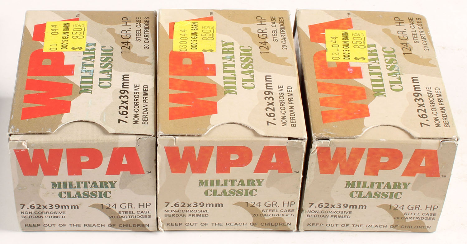 WPA, Lot of (3), Military Classic, 7.62x39 mm, 124 Grain Hollow Point, Steel Case, Full, boxes are excellent, ammo is minty. Grade: Excellent ++ - Value: 20 to 40