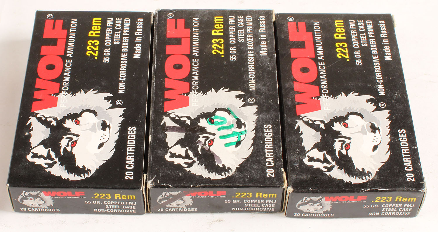 Wolf, Lot of 3, 223 Rem, 55 Grain Copper FMJ, Full, 1pc., Multi-colored box, box is solid with excellent color, Ammo is excellent. Grade: Excellent - Value: 20 to 50