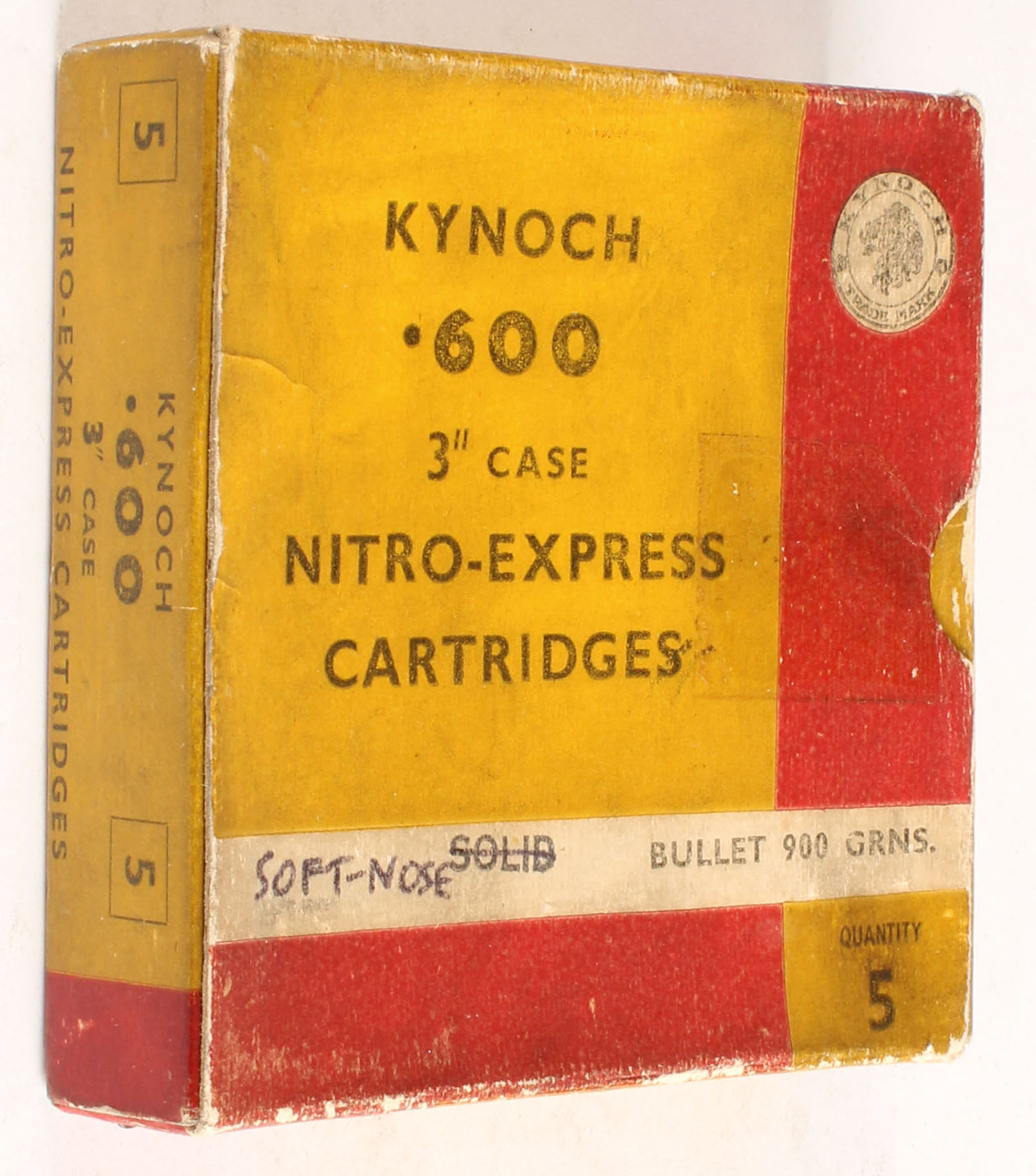 Kynoch, .600 Nitro-Express Cartridges, 3 '' Case, 900 Grain Metal Covered Soft Nose Bullet, Full, 1pc. Yellow red & white box, box is solid with excellent color, minor age soiling, very minor edge & corner wear, end flaps are solid, ammo is very good. Grade: Very Good ++ - Value: 100 to 300
