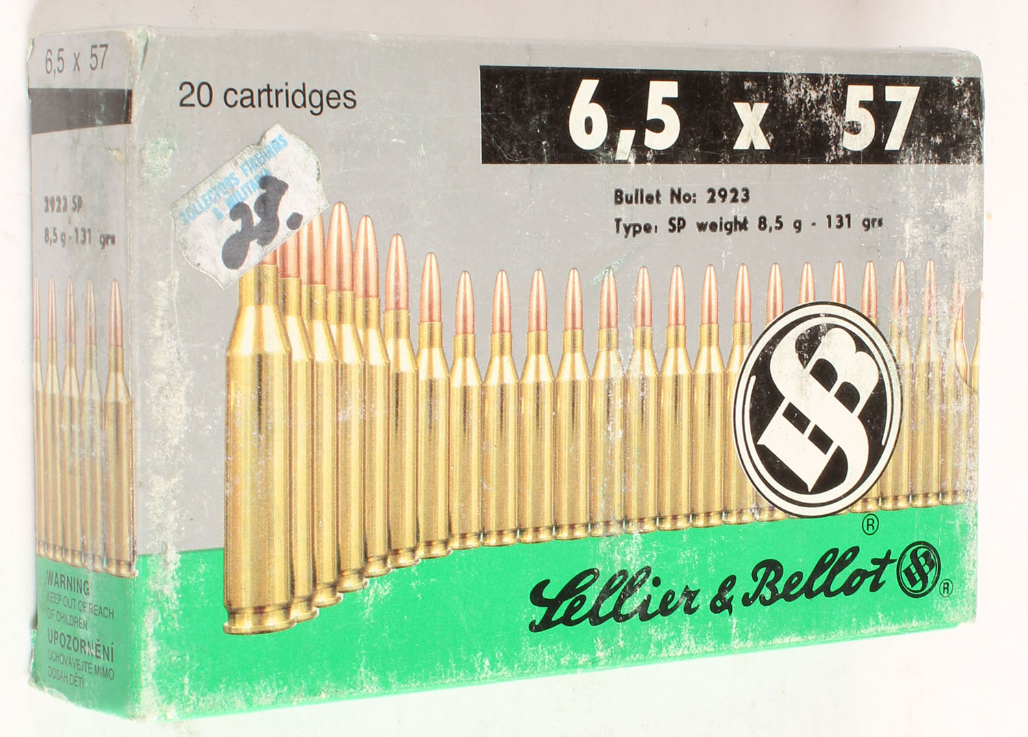 Sellier & Bellot, 6.5 x 57, 131 Grain Bullet, Full, 1pc. Silver & green box, box is solid with very good color, shelf wear, some edge & corner wear, end flaps are solid, ammo is excellent. Grade: Very Good + - Value: 8 to 40