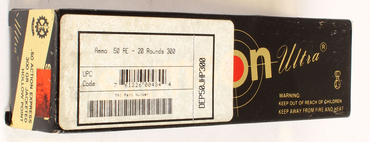 Samson, Ultra, .50 AE, 300 Grain Jacketed Hollow Point, Full, 1pc. Black & gold box, box is solid with minty color, very minor corner wear, edges are crisp, end flaps are solid, ammo is excellent. Grade: Excellent ++ - Value: 20 to 60