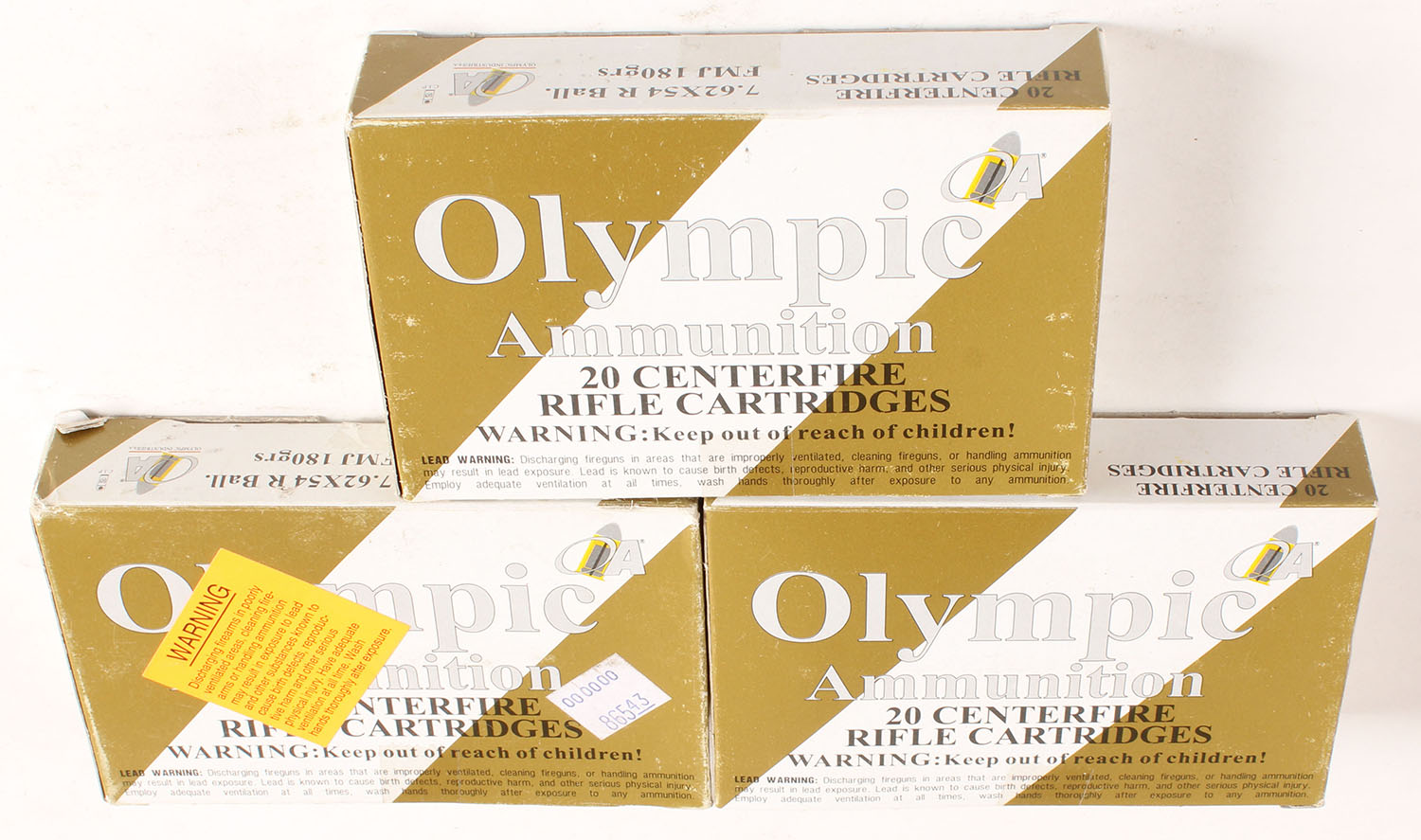 Olympic, Lot of (3), 7.62 x 54R, 180 Grain FMJ, Full, 1pc. White & gold boxes, boxes are solid with excellent color, ammo is minty. Grade: Excellent ++ - Value: 16 to 60