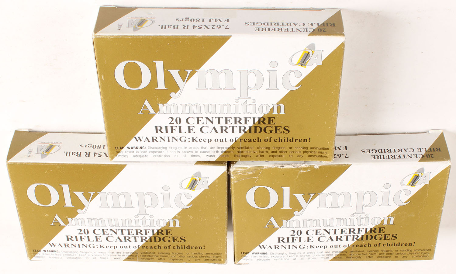 Olympic, Lot of (3), 7.62 x 54R, 180 Grain FMJ, Full, 1pc. White & gold boxes, boxes are solid with excellent color, ammo is minty. Grade: Excellent ++ - Value: 16 to 60