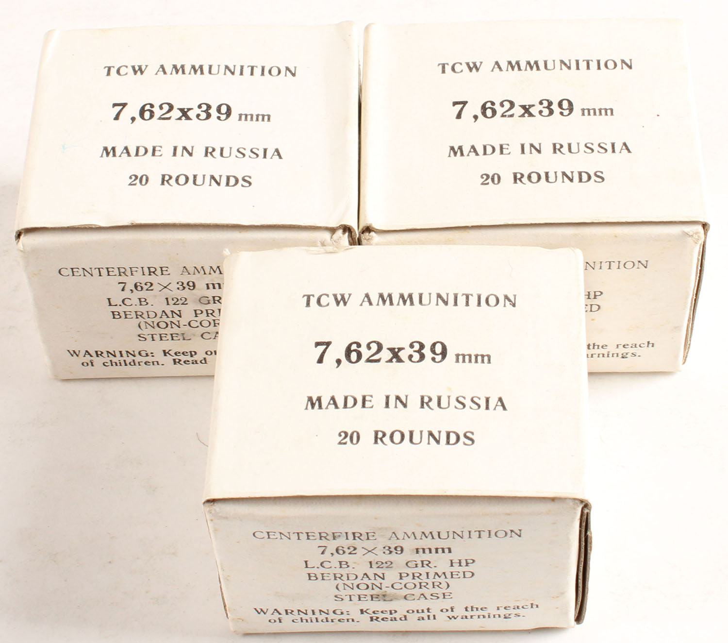 Unknown Russian Mfg., Lot of (3), 7.62 x 39mm, LCB, 122 Grain HP, buff boxes with black printing, ammo is minty. Grade: MINT - Value: 16 to 60