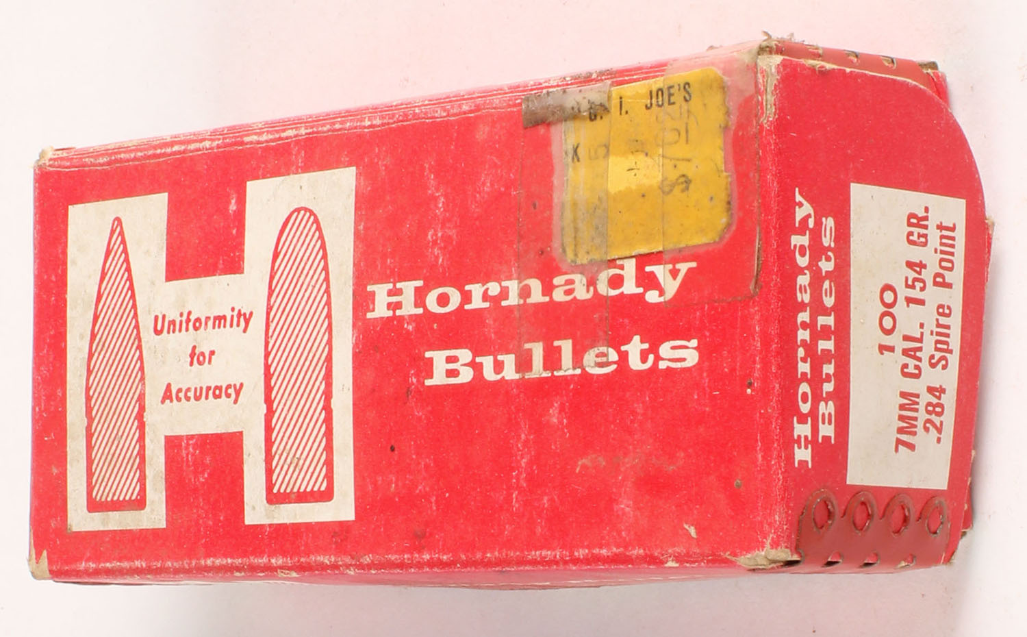 Hornady, 7mm Cal., 154 Grain .284 Spire Point, Full, 1pc. Red & white box, box is solid with excellent color, very minor age soiling, corners are mostly sharp, edges are crisp, bullets are minty. Grade: Excellent - Value: 10 to 40