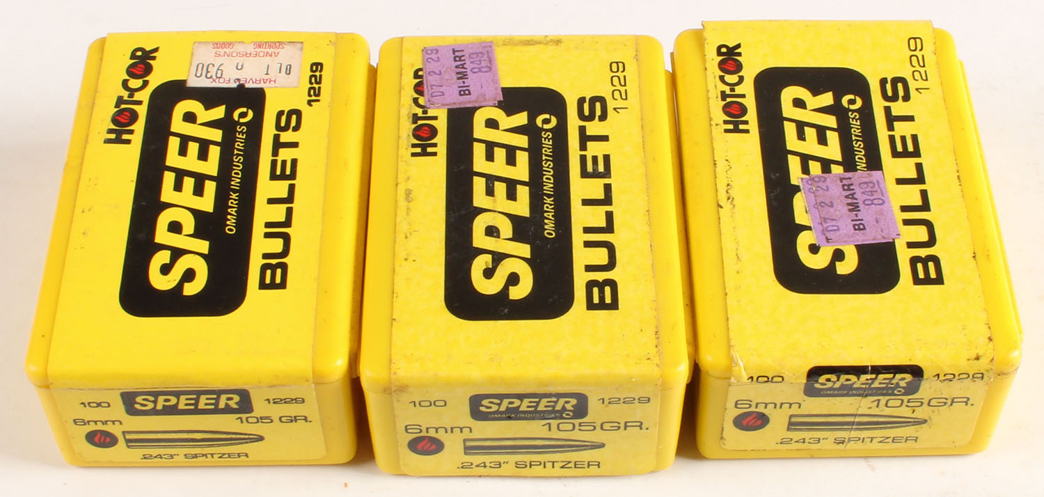 Speer, Lot of 3, 6mm, .243'' Spitzer, 1 box is FULL & SEALED, the other 2 boxes are Partials, boxes are very solid with one box having foam pieces in it. Grade: Very Good ++ - Value: 20 to 60