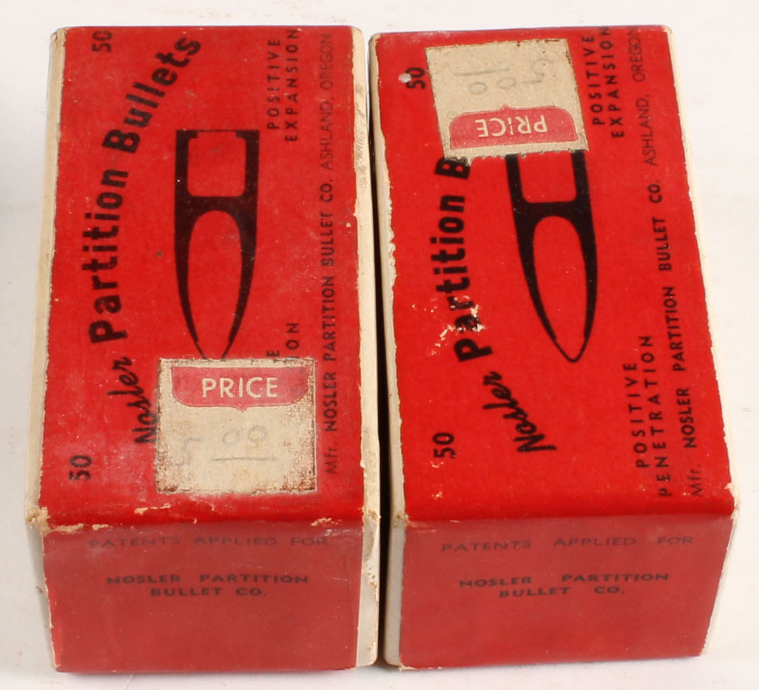 Nosler, Partition Bullets, Lot of 2, .270 Cal, 150 Grain, Soft Point Spitzer, FULL & SEALED, 2pc, buff box with red label & black print, boxes are very solid with shelf wear. Grade: Excellent - Value: 20 to 60