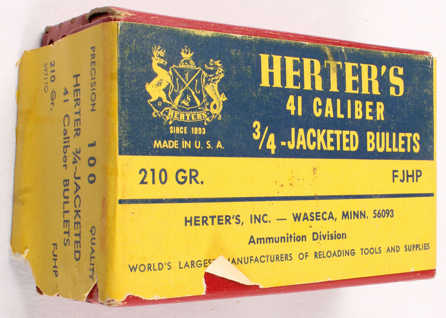 Herter's, 41 Caliber, 3/4 Jacketed Bullets, 210 Gr. FJHP, Full, 1pc, box is solid, red box with multi-color label, bullets are excellent. Grade: Very Good ++ - Value: 10 to 40