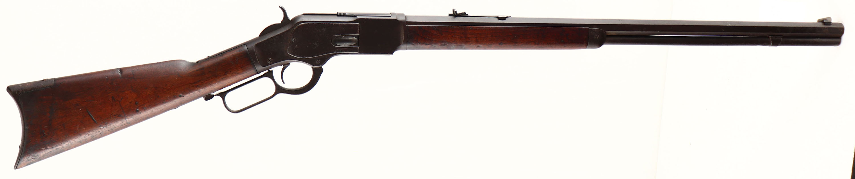 Winchester, Model 1873, 3rd Model, 32 WCF Cal., MFG. 1884 (Antique), SN: 168300, Lever Action Rifle, 24 1/4'' Octagon Barrel, Full mag, The wood stock & forend are very good, solid & original, retaining much of the original finish, but also with lots of small contusions, scrapes & scratches. The metal carries a full brown patina, with areas of rust pitting. Bore is dark, pitted & rough, but with remains of rifling. Barrel carries an adjustable rear sight & an updated blade front sight which is currently mounted backwards. Sliding dustcover is a more recent blued replacement. Crescent metal buttplate. A solid antique 1873 in .32 cal., with the correct old west aesthetic. Antique No FFL Req. - Value: 1500 to 3000