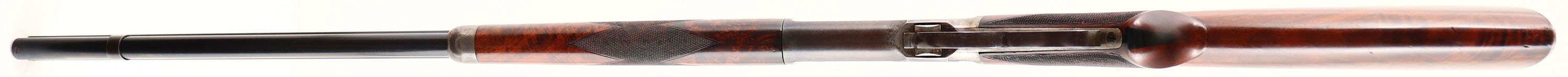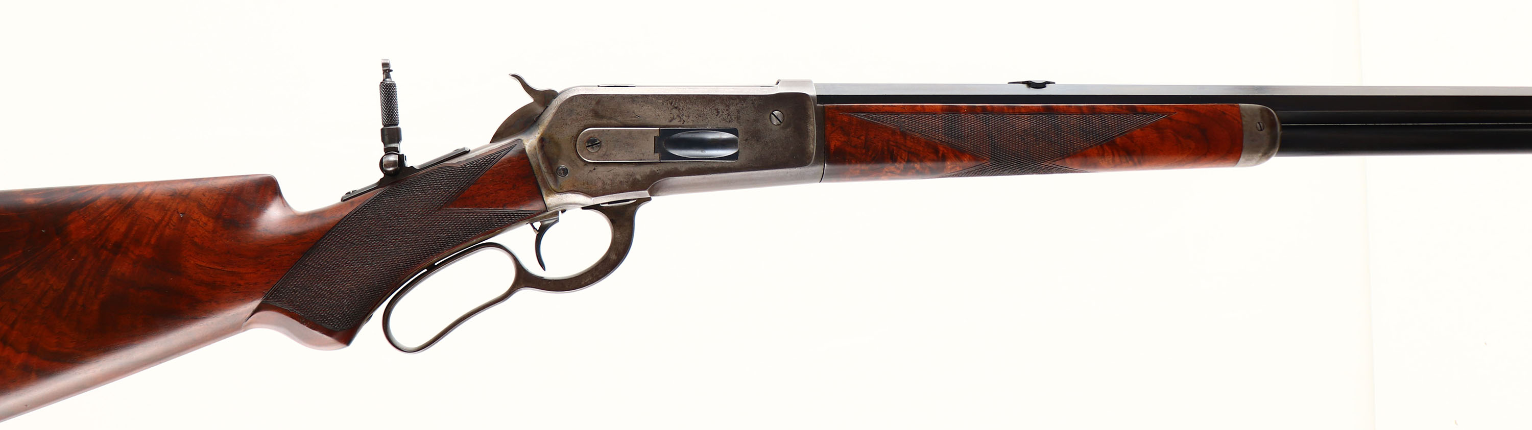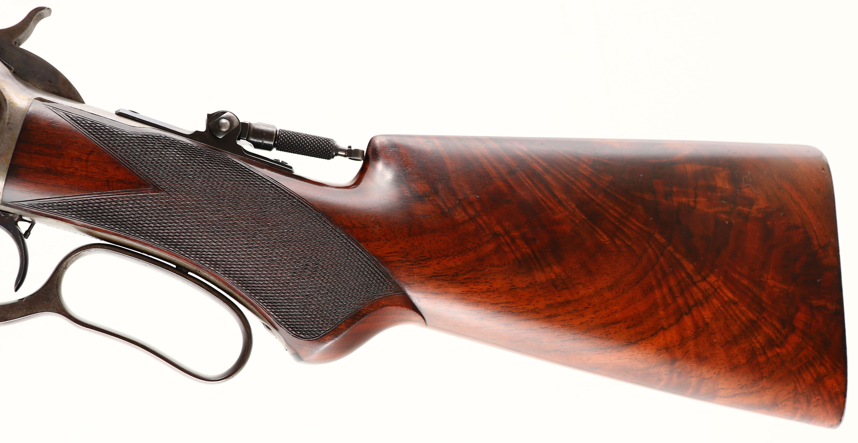 WONDERFUL Winchester, Model 1886 Deluxe, CAL: 40-82 WCF, MFG: 1891 (Antique), SN: 61664, Lever Action Rifle, 26'' Octagon barrel, Full mag. This Special Order Rifle has been partially & professionally restored. Mounted with fantastic, XX center crotch, rippled & feathered grain American walnut, with ''H'' style checkering. Serpentine pistol grip stock with the ebony inlay in the pistol grip & a Winchester metal widow's peak, shotgun style buttplate. The stocks are excellent, as professionally refinished. There are very few tiny handling marks remaining, with excellent original checkering. There is a tiny 1/8'' toe chip repair that presents well & flows nicely with the natural grain pattern. The professionally restored metal blue finish on the barrel & mag rates 98%, with some thinning of the original barrel stamps during barrel preparation. The restored blue matches original Winchester blue & is very well done. The sliding bolt retains a full 90% of the original bright blue, while the loading gate rates 95%. The receiver, lever, hammer, forend cap & buttplate are all case-hardened, having toned mostly gray, with outlines of old case-colors & some actual colors left in more protected areas of the receiver. The left side of the lower tang, under the wood, is stamped with the assembly number ''248'' & ''SXX'' for shotgun butt & XX grade wood. The upper tang channel in the stock is stamped with the same ''248'' assembly number. The underside of the buttplate is likewise stamped with the ''248'' & ''S'' for shotgun butt. The rifle is fitted with a Lyman tall stem flip-up tang sight, while the barrel carries a Marble's blank filled rear dovetail & original blade front sight. Bore is excellent. This Special Order deluxe rifle presents extremely well & remains very collectible as an early case-colored 1886.* Antique, No FFL Req. - Value: 7000 to 12000