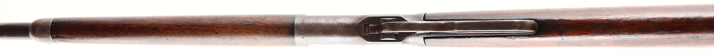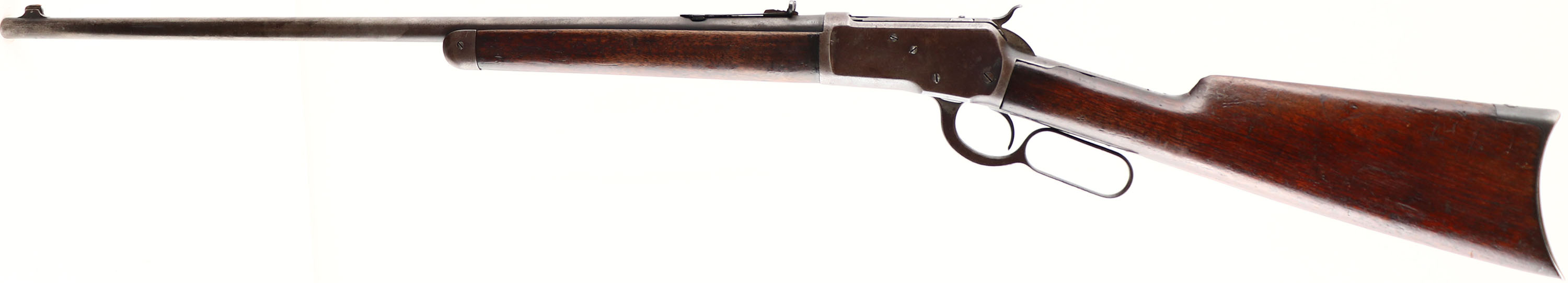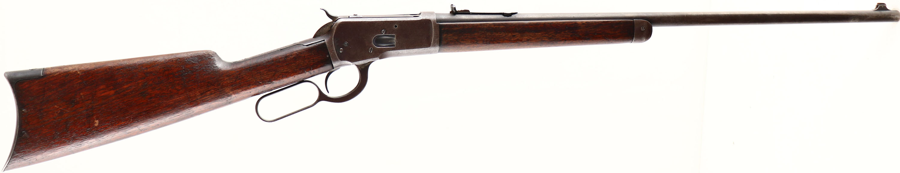 Winchester, Model 1892, CAL: 32-20, MFG: 1908, SN: 439086, Lever Action Rifle, 24 1/4'' Round barrel. Half mag. The original straight grip wood stock & forend are good & solid, despite a number of grain stress cracking running horizontally along the sides of the stock, at the buttend & the wrist. These cracks are from heavy use &/or drying out of wood & do not compromise stability. Most of the original finish has worn off the wood, with some old added finish on the stock, which is also thinning. There are numerous minor contusions, scrapes & scratches. The original metal blue finish on the receiver has worn to a thin brown patina. The barrel is an old unmarked replacement, without caliber marking, which matches the wear & finish of the receiver. Bore is very good. The barrel holds an adjustable rear sight & blade front sight. The is a filler screw on the top of the bolt from where a possible bolt mounted sight once resided. Buttstock carries a crescent metal buttplate. Smooth action. The rifle seen a lot of use, but likely remains a good shooter. FFL or C&R Req. - Value: 500 to 1000
