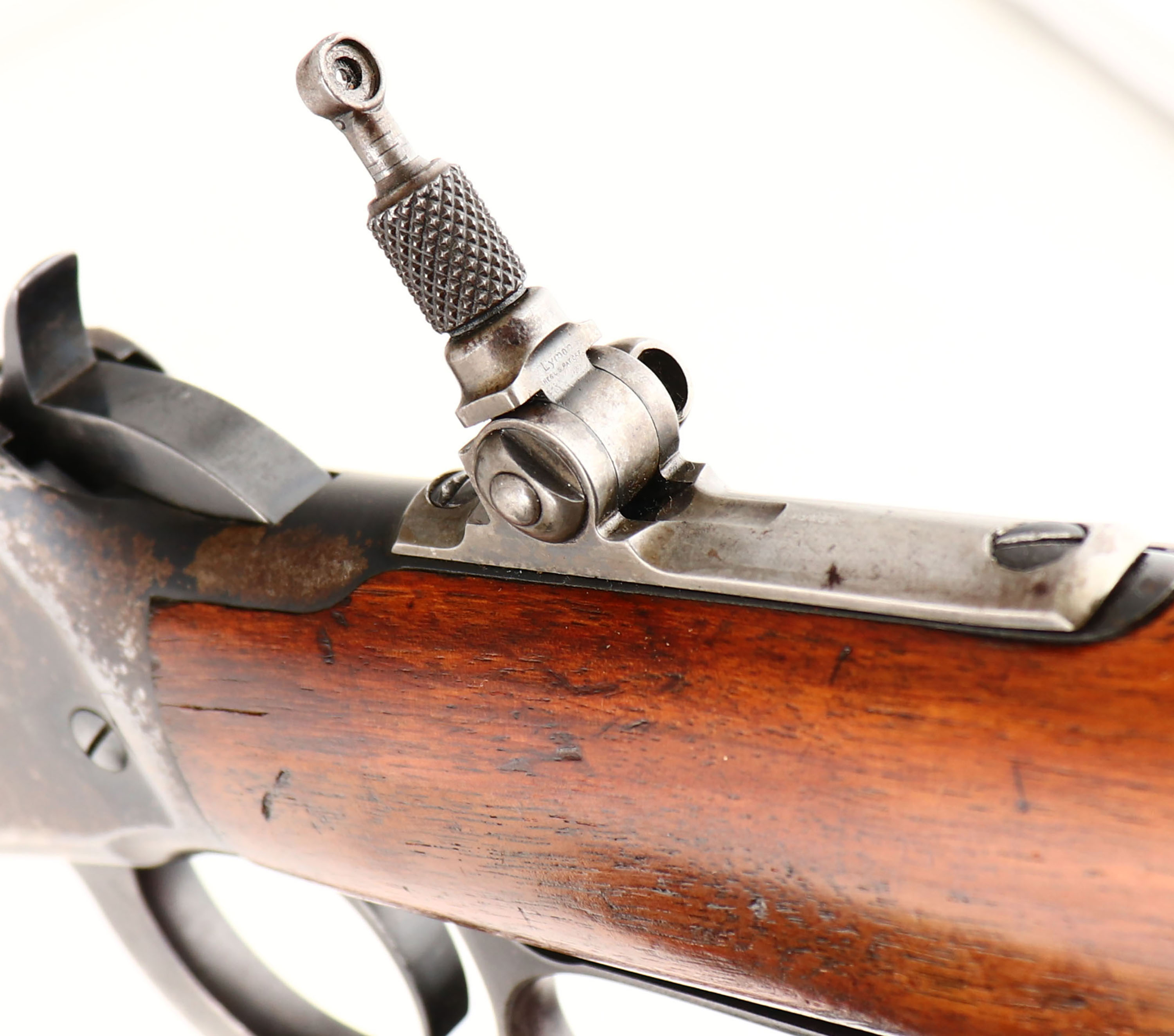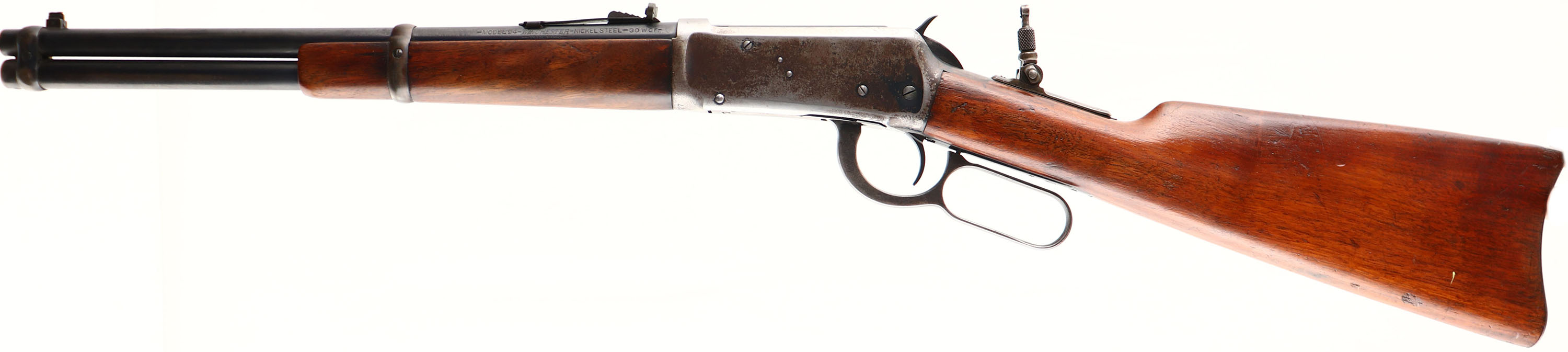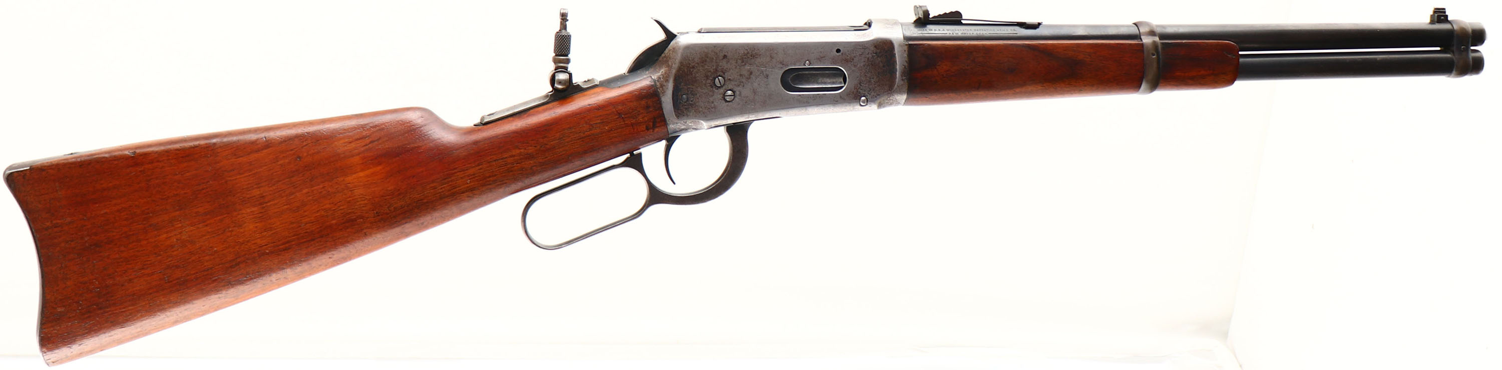 RARE Winchester, Model 94 15'' TRAPPER CARBINE, CAL: 30-30 WCF, MFG: 1929, SN: 1051727, Lever Action Carbine, 15'' Round barrel, Full mag. The included factory letter indicates only that the SN was applied on July 25, 1929. Also included is a copy of the ATF C&R exemption log showing the carbine is a 15'' barrel gun, which is exempt & legal for you to own. The smooth walnut straight grip wood stock & forend are excellent, with the expected scattered light dings & minor handling marks, otherwise retaining a very nice overall fit. The forend is the correct shorter 8'' length. The metal blue finish rates 85% on barrel & mag, while the receiver has worn mostly gun metal gray, with a thin sprinkling of brown patina & spots of original blue in the most protected areas. Bore is unusually excellent for these trappers & way above average. The loading gate & bolt retain much of the original blue. The carbine is fitted with a Lyman tang peep sight, while the barrel carries a replacement adjustable rear & a carbine box & blade front sights. Buttstock carries a smooth carbine metal buttplate. All markings remain intact & strong. The action is tight & smooth & appears to function well mechanically. An excellent example & very collectible as a rare & legal 15'' trapper. FFL or C&R Req. - Value: 10000 to 15000