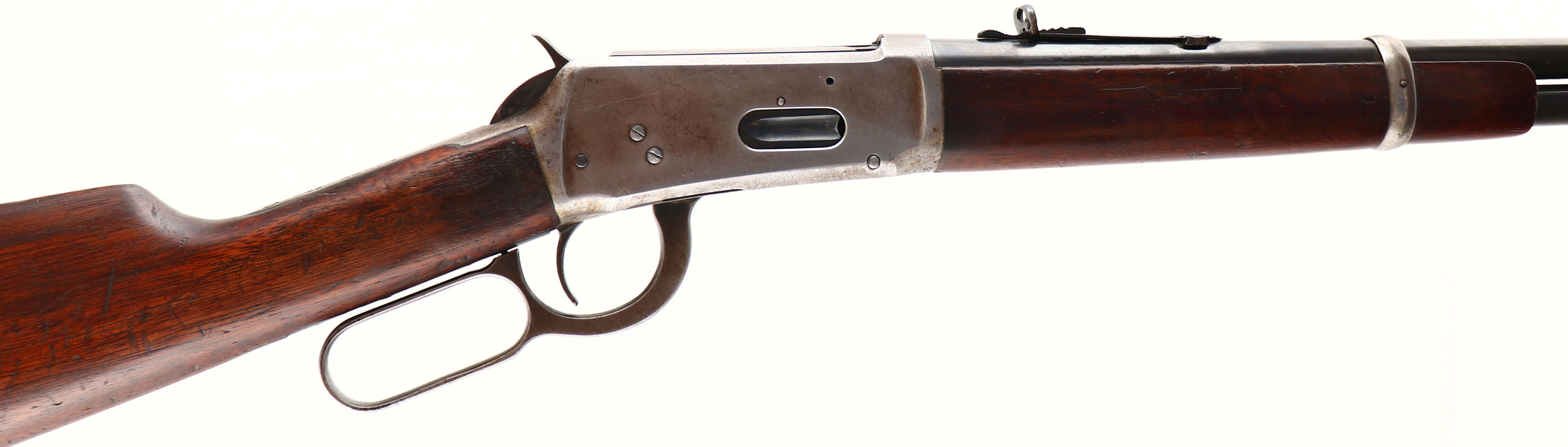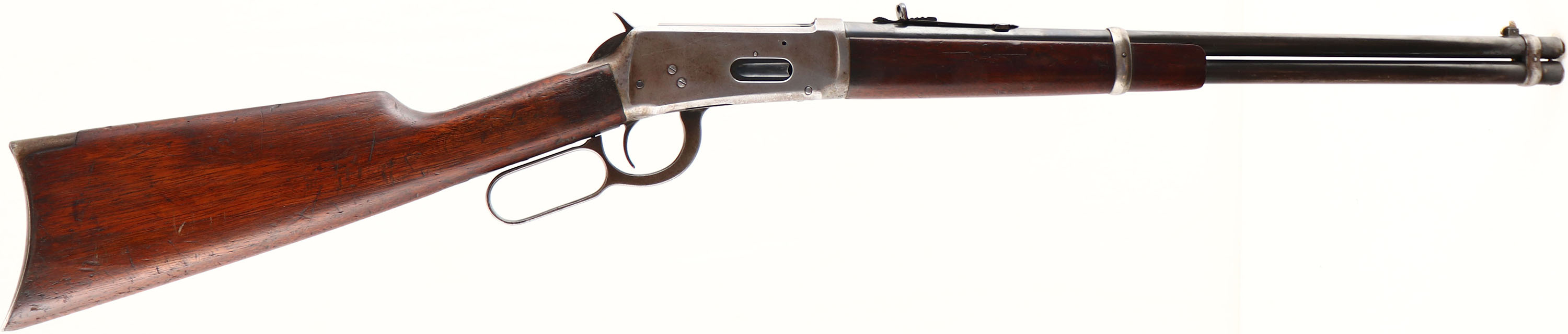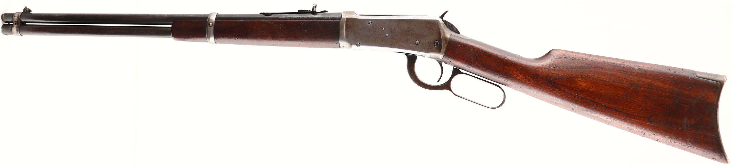 Winchester, Model 94 Eastern Carbine, marked 30 W.C.F. Cal., MFG: 1921, SN: 928044, Lever Action Carbine, 20'' Round barrel, Full mag., The original wood stocks are very good & solid, with numerous small scratches, scrapes & contusions to the original finish, which is thinning with wear. The original factory blue finish rates 90% on the barrel, 70% on the mag tube, while the receive has worn gray. The barrel carries a full buckhorn adjustable rear & carbine box front sight, with a replaced blade. Bore is very good. The stock carries the original crescent metal buttplate. A nice original eastern carbine. FFL & C&R Req. - Value: 1200 to 2500