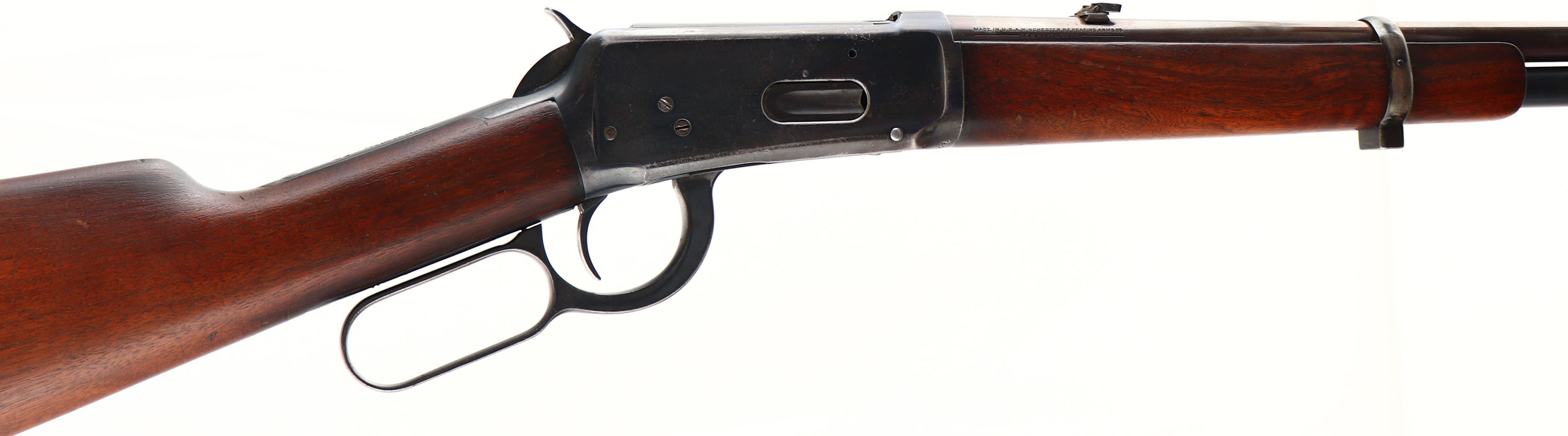 Winchester, Model 94 SRC, marked 30 W.C.F. Cal., MFG: 1926, SN: 988526, Lever Action Carbine, 20'' Round barrel, Full mag., The original wood stocks are good & solid, as sanded & refinished. The stock has been cut & carries a worn out ventilated recoil pad. There a very few handling marks or contusions remain. The metal was reblued long ago as indicated by wear loss. The receiver & mag carry 60% blue, while the blue on the barrel has worn mostly gray, with s slight plum tone. The left side of the receiver has an area of lots of stippled abrasions. The barrel carries a folding leaf rear sight, which has lost it's spring, & box front sight, with replaced blade. The upper tang has two open holes where a tang sight once resided. Bore is very good. The saddle ring has been removed & the lug ground down prior to the rebluing process. The stock carries a sling loop, while the front barrel band had a sling provision added, but is missing the loop. The carbine appears to function well, but could use a bit of work & parts to improve the overall aesthetic. FFL & C&R Req. - Value: 300 to 500