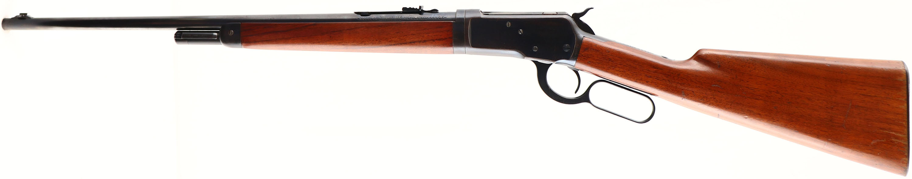 RARE Winchester, Model 53 TAKE-DOWN, CAL: 44 WCF, MFG: 1924, SN: 362, Lever Action Rifle, 22'' Tapered round barrel. Half mag. In 1924, Winchester introduced the Model 53 lever-action rifle as a modernized version of the model 1892. Production lasted just 8 yrs until 1932, with a very limited production of approximately 25,000. This rifle is a 1st YEAR PRODUCTION, early 3 digit SN. The original straight grip wood stocks are excellent, with minor surface scrapes, contusions & scratches. There is some flaking of the finish on the buttstock along the edge of the buttplate. It appears the original finish on the forend was either touched-up or removed & very nicely refinished, but without wood loss & matches the stock. The metal blue finish on the barrel rates 95%, with small scrapes at the area of the takedown lever. The receiver blue rates 75%, with most thinning wear at the handling points of the belly, which is toning to a light brown/gun metal grey patina. Bore is excellent & bright, with proud rifling. The barrel holds a flat top adjustable rear sight & low profile front sight. Buttstock carries a grooved metal buttplate. A very nice example of a first year, take-down 53 in the very desirable 44 WCF. FFL or C&R Req. - Value: 5000 to 9000