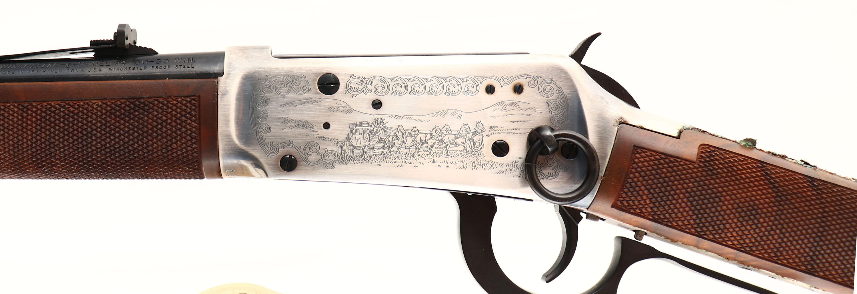 BOXED Winchester Model 94 Wells Fargo & Co. Commemorative, CAL: 30-30, MFG: 1977, SN: WFC311, Lever Action Rifle, 20'' barrel. The left side of the receiver displays an intricate engraving of a Wells Fargo Stage Coach being pulled by horses, bordered by an ornamental pattern & on the right, '' W.F.& CO. 1852'', an image of a W.F. storefront, 1977'' bordered by an ornamental pattern. The checkered, straight grip wood stocks are excellent, with very few tiny handling marks. The stock displays fabulous rippled & feathered grain & includes an inlaid silver W.F. medallion. The metal blue finish rates 98%, with a couple small area of spotting on barrel. The rifle was stored in it's factory box since original purchase, but not always with proper temperture controls & it did cause heavy rust pitting & corosion on the upper & lower tangs & buttplate. The rest of the polished coin silver receiver is excellent, with some light thin surface scratches. Bore is excellent. Factory sights. Buttstock carries a smooth metal buttplate, with rust. Comes in its original box, with hang tag. A beautiful commemorative saddle ring carbine that will need some work to clean-up or repair metal damage on tangs. Only 19,999 produced. FFL or C&R Req' - Value: 400 to 800