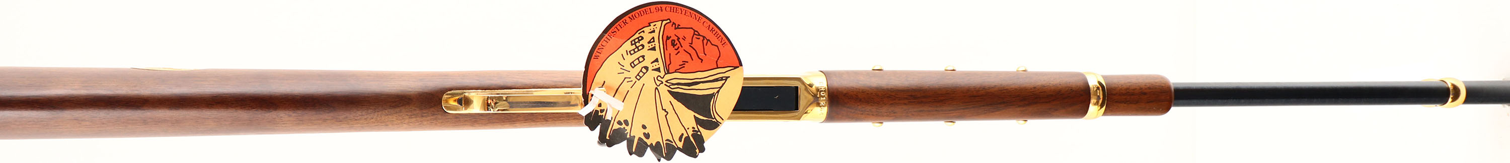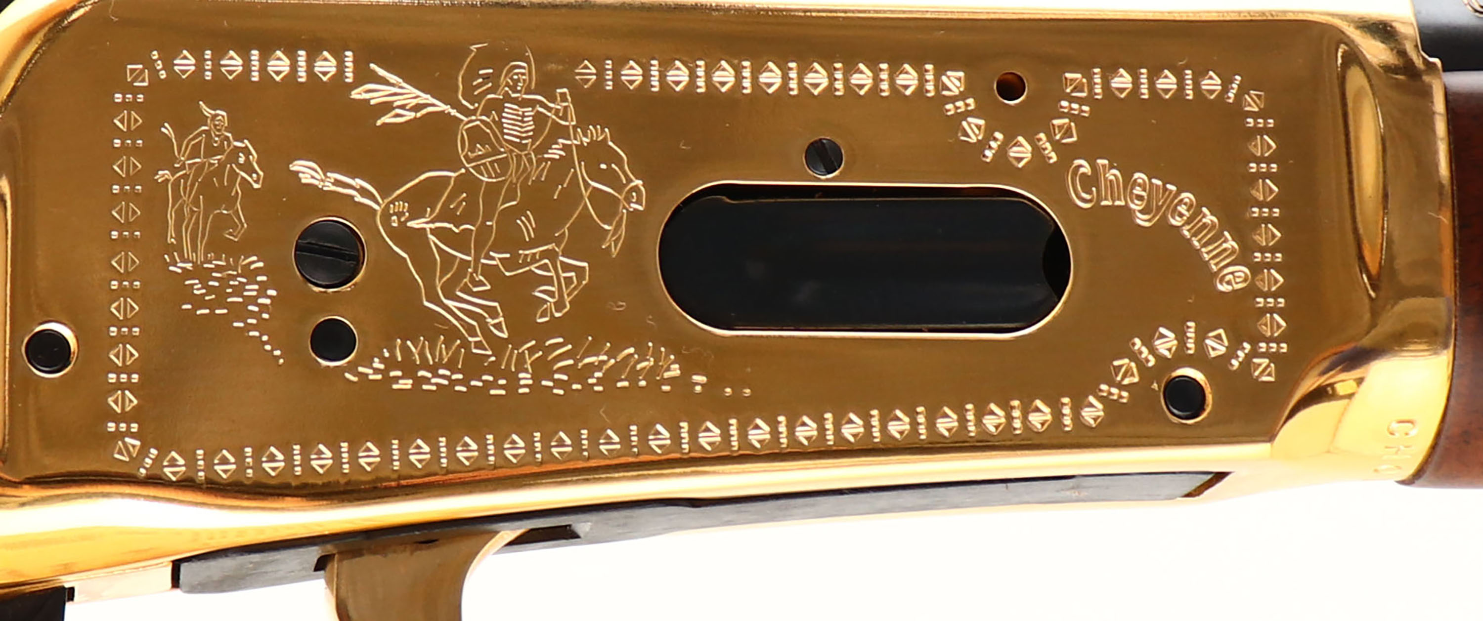 BOXED Winchester, Model 94 Cheyenne Carbine, 44-40 WIN Cal., MFG. 1977, SN: CH01264, Lever Action, 20'' barrel. In 1977 Winchester produced 11,220 of these Commemorative Cheyenne Carbines. The gold washed receiver is engraved on both sides with vignettes that celebrate the ''Great Plains Cheyenne's''. The handsome straight grip walnut stocks carry gold washed tacks in the forend & a gold tone Cheyenne medallion inlayed into the right side of the stock. The stock & the factory finish are basically mint. The gold tone receiver, lever & barrel bands are excellent. The original metal blue is 99.9%. Bore is mint. The rifle is fitted with a sliding aperture adjusting tang sight, while the barrel carries the original adjustable rear & hooded blade front sights. The stock carries a blued crescent metal buttplate. Comes in the original numbers matching styro box, with sleeve, wax paper, hanging tag & paper work. Sleeve is excellent. Another excellent Winchester collectible. FFL or C&R Req. - Value: 1000 to 2000
