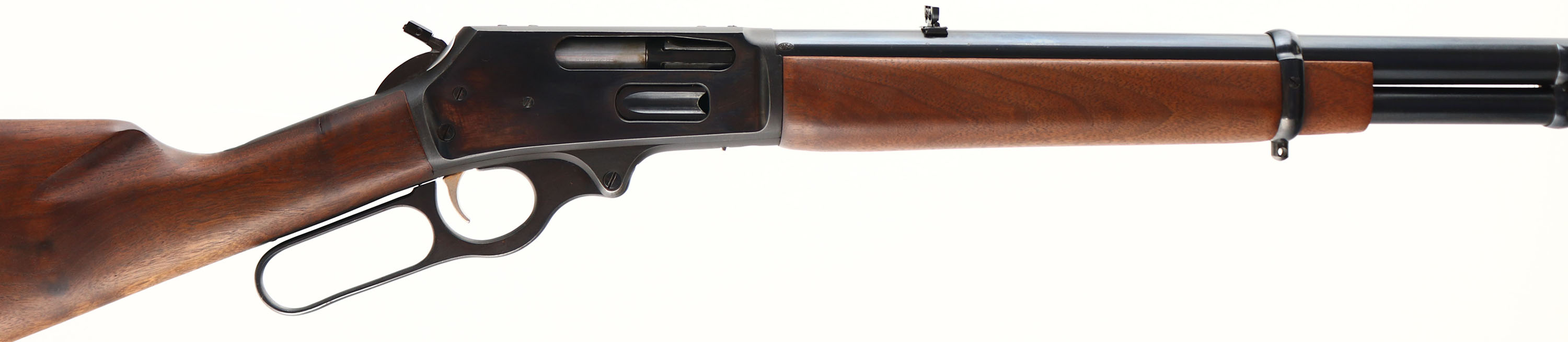 Marlin Firearms Co. Model 444, CAL: 444 MARLIN, MFG: Late 1960s, SN: AA29738, Lever Action Rifle, 24'' Micro-grooved barrel. The original straight grip Monte Carlo wood stocks are very good, as lightly sanded & re-oiled. The stocks have very few handling marks remaining. The original metal blue finish rates 95%. Bore is excellent. Receiver once carried a scope, with some residue remaining on top of receiver. The barrel carries a folding leaf rear & hooded ramp/blade front sight. Sling studs. Gold trigger. Buttstock carries a Marlin ventilated brown rubber recoil pad. JM hammer attachment. Bullseye trademark in belly of the stock. FFL or C&R Req. - Value: 500 to 800
