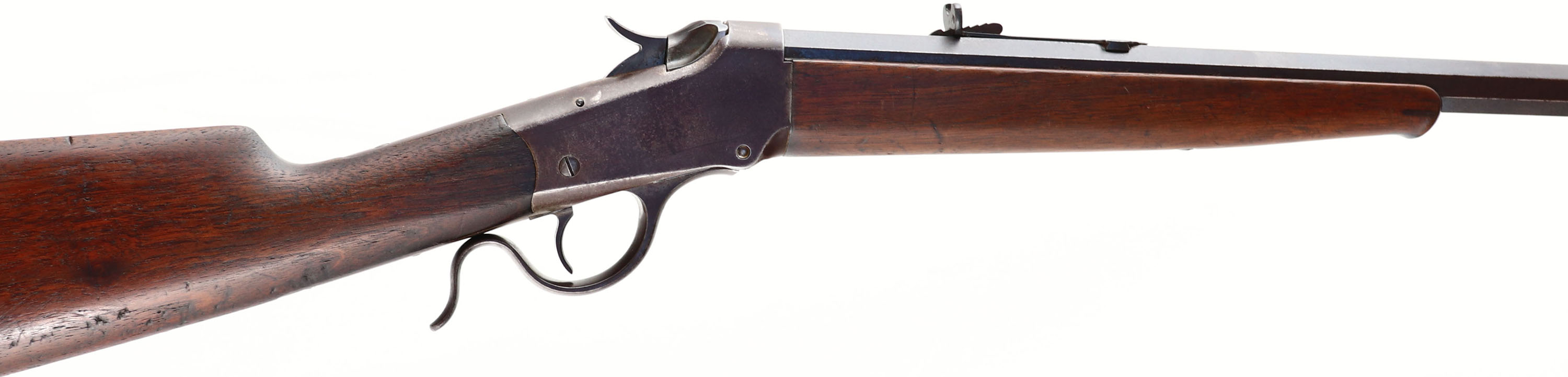 Winchester, Model 1885 Low Wall Rifle, Marked: 25 R.F., MFG. 1897, SN: 80220, Lever Action Single Shot Rifle, 26'' Octagon #1 marked barrel. The original wood stocks are very good, with numerous small contusions, scrapes & scratches the original finish. There are a dozen small notches on the top of the comb by the upper tang of the crescent metal buttplate. Ebony tipped forend. The original metal blue finish on the has toned to a even chocolate brown patina. Bore is fair, with lots of pitting & roughness amongst some visible rifling. The barrel carries an adjustable rear & pinched blade front sights. Metal crescent buttplate. The # ''1'' is stamped in front of the forend tip on the barrel, for barrel size. A solid & all original 1885 rifle. Antique No FFL Req. - Value: 500 to 1000