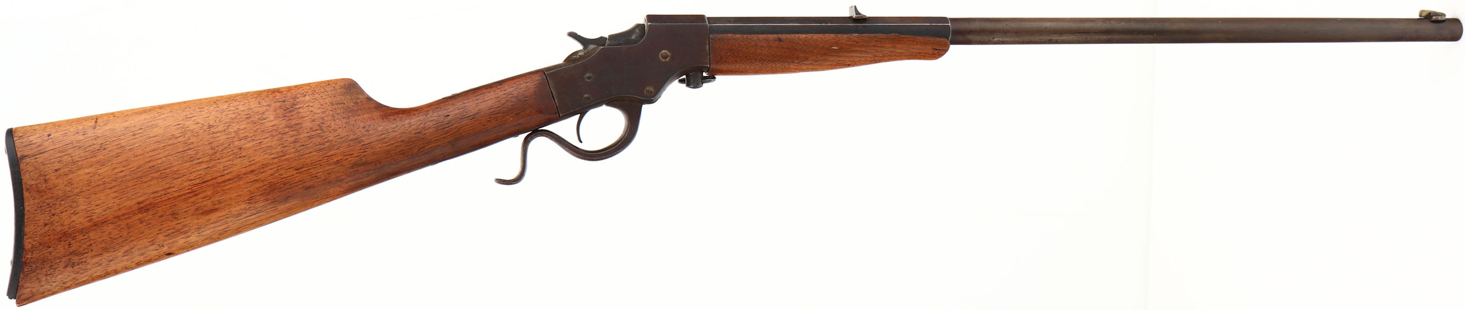 J. Stevens A. & T. Co., Favorite, 32 LONG Cal., SN: B489, MFG. 1894-32, Lever falling block take-down rifle, 22'' Octagon to round barrel, The original wood stocks are good, having been sanded & refinished. There remains a few minor handling marks or contusions. The forend tip has a missing sliver of wood to the right upper edge. The metal surfaces are a mix of gun metal gray, brown patina & applied brown finish over cleaned pitting. Barrel carries a fixed rear sight & a Rocky Mountain blade front sight. Bore is good, with spotty roughness amongst solid rifling. Black plastic ''Stevens Favorite'' buttplate, with a broken chip at the top. Tight mechanism. FFL or C&R Req. - Value: 150 to 300