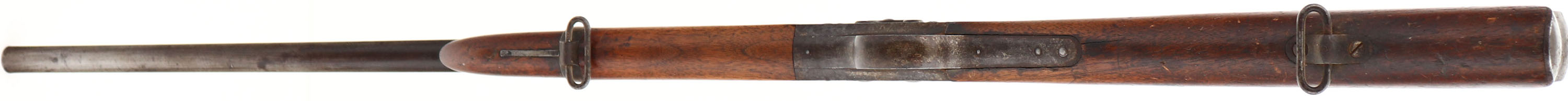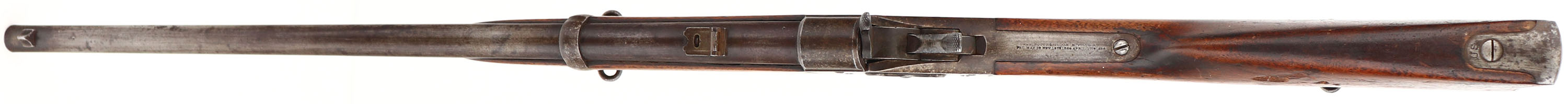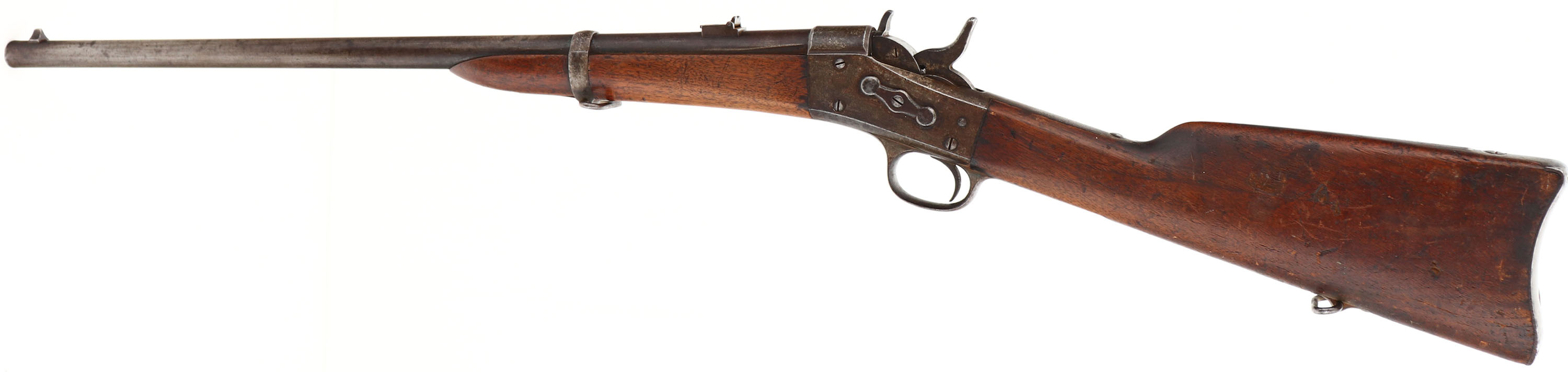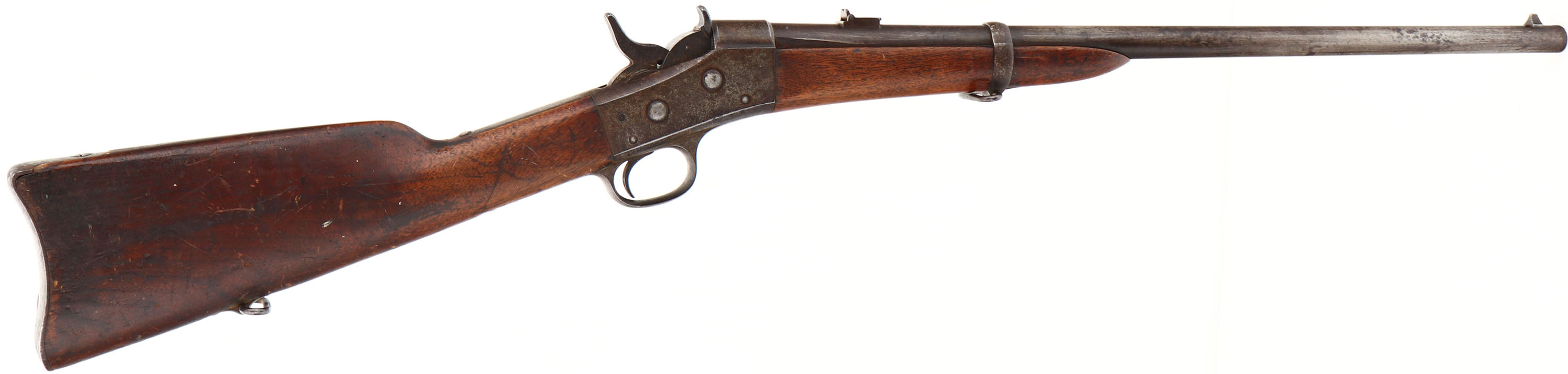 Remington, Model M1867 Rolling Block Carbine, .50 C.F., MFG 1868-69, SN: None, Rolling block single shot carbine. 23 1/4'' Round barrel. The carbine is clearly marked on the receiver tang in two lines: ''REMINGTON ILION, NY U.S.A. PAT. MAY 3D NOV. 15TH 1864 APRIL 17TH 1866''. The buttplate is clearly stamped ''U.S.'' on the tang. The barrel band has he usual ''U'' mark. No cartouches are present. The Model 1867 has NO sling ring & bar. Instead, it has a butt swivel & a front swivel mounted on the barrel retaining band. The original straight grip wood stocks are very good & solid, with numerous small scrapes, scratches & contusions to what appears to be the original finish. There is a couple larger gouges on the left side of the stock. The barrel has worn mostly gun metal gray, with a thin brown patina, while the case-hardened receiver has faded gun metal gray & a thin brown patina developing. Bore is very good. Barrel sights are original & correct, with the rollover folding leaf sight stamped 1, 3 & 5. The stock carries the original smooth metal carbine buttplate. Antique, No FFL Req. - Value: 500 to 1000