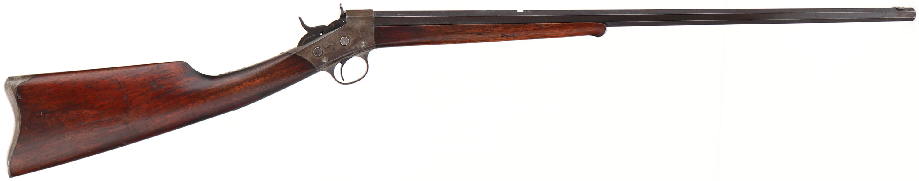 Remington, Model 2, .32 SHORT or LONG R.F., MFG 1873-1909, SN: 33779, Rolling block single shot rifle. 26 1/8'' Octagon barrel. The original straight grip, perch belly wood stocks are very good & solid, showing several small marks & contusions to what appears to bean added layer of finish over the original finish. The schnabel forend has a small chip at the ebony insert. The barrel has toned to an even brown patina, while the case-hardened receiver has faint outlines & remains of case-colors, with the majority faded gun metal gray & a thin brown patina developing. Bore is very good. Barrel an open rear dovetail & a blank filled front dovetail, no sights. The stock carries the original smooth metal buttplate. FFL or C&R Req. - Value: 300 to 600