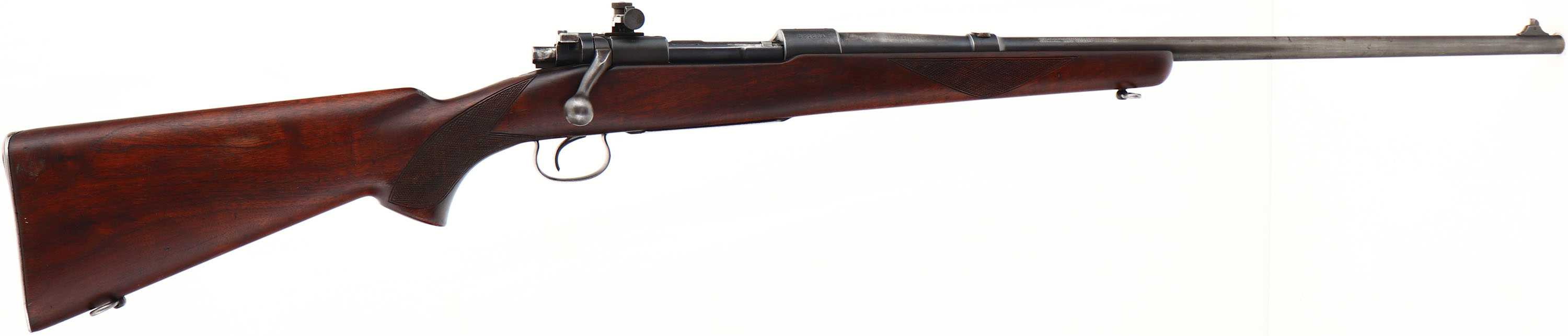 Winchester Model 54, CAL: .30 GOV'T'06., MFG: 1931, SN: 35168A, Bolt Action Rifle, 24'' barrel. The model 54 was the first successful civilian bolt action for Winchester. They are fairly rare model with total production of just over 50,000 in all variations from 1925 to 36. The original checkered & flat pistol grip wood stock on this example is very good, with several minor contusions, scrapes & scratches to the original finish, which has darkened from use & added oils. The original metal blue finish rates 80% on the receiver, 20% on the barrel, while the floorplate & trigger guard have worn & been polished silver. Bore is excellent. The rifle is fitted with an adjustable Lyman 48W receiver sight, while the barrel has a blank filled rear dovetail & pinned blade front sight. Some wood alteration around the Lyman receiver sight. Buttstock carries the original serrated metal buttplate. Sling loops. A good example of a rare early Winchester bolt action. FFL or C&R Req - Value: 1000 to 2000