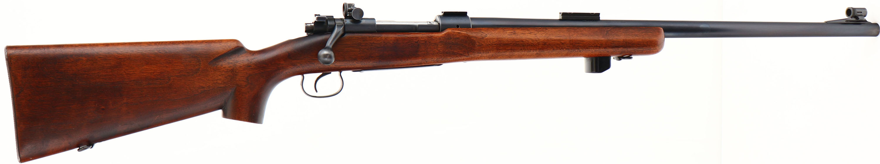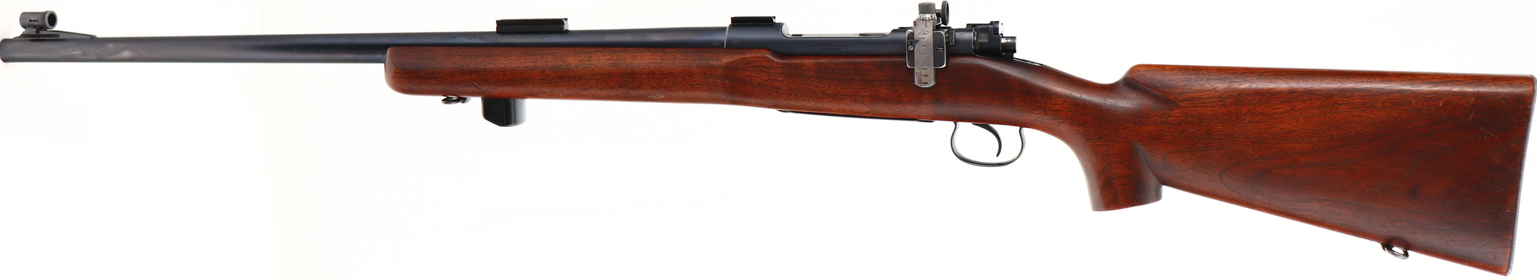 RARE Winchester Model 54 TARGET RIFLE, CAL: .30 GOV'T'06., MFG: 1934, SN: 41097A, Bolt Action Rifle, 24'' heavy round barrel. The model 54 was the first successful civilian bolt action for Winchester. They are fairly rare model with total production of just over 50,000 in all variations from 1925 to 36. The Target Rifle is one of the rarest model 54 variations, only surpassed by the National Match Rifles. This particular rifle is listed by SN on page 146 of Dave Bichest's Model 54 book, ''Winchester Model 54 Bolt Action Rifle 1925-1936''. The original Target flat pistol grip wood stock on this example is excellent, with few minor contusions or light scratches to what appears to be the original finish. Fitted with a hand stop on the belly of the forend. The metal blue finish appear original & rates 98%, although the SN appears thinly stamped. Bore is excellent. The rifle is fitted with an adjustable Lyman 48W receiver sight & a Lyman silhouette front sight. Receiver & barrel carry factory scope blocks. Buttstock carries the original checkered metal buttplate. Factory sling loops. An excellent example of a rare bench Winchester bolt action. FFL or C&R Req - Value: 2500 to 4500
