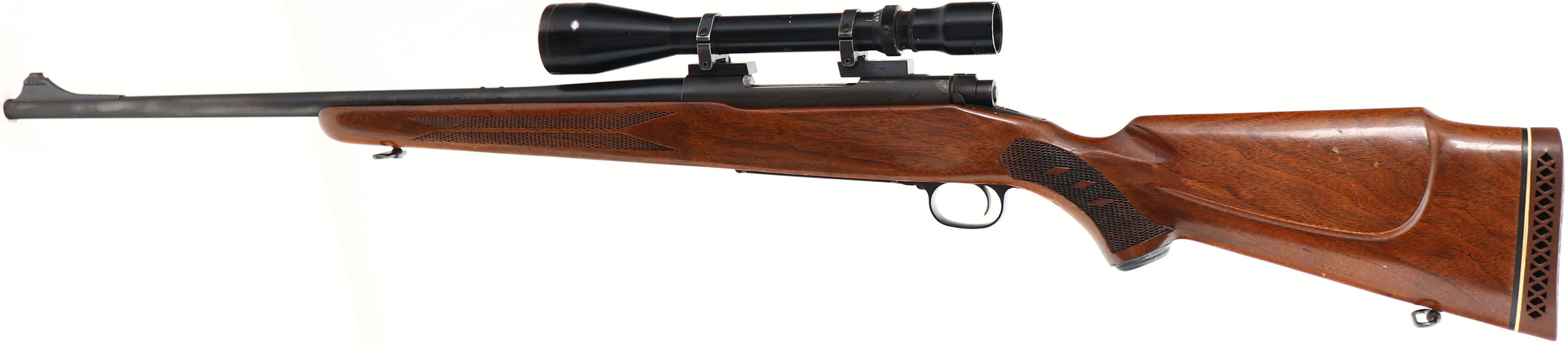 Winchester Model 70, CAL: 30-06, MFG: 1964, SN: 700423, Bolt Action Rifle, 22'' barrel. The checkered, cheeked, & capped pistol grip Monte Carlo wood stock is very good, displaying several finish level scrapes to the original finish, along with other small handling marks The checkering pattern has the three diamonds in the pistol grip. The metal blue finish rates 95% on the barrel, 90% on the receiver, & 80% on the floorplate which shows some spotty loss. Bore is excellent. Fitted with a Bausch & Lomb Balvar 8 2.5-8 scope on Leupold blocks & rings. The barrel carries screw filled rear sight holes & tall ramp front sight. Buttstock carries a Pachmayr White Line ventilated brown recoil pad. Sling swivels. Matching SN on jeweled bolt. A very nice vintage hunting rifle in the classic 30-06 caliber. FFL or C&R Req - Value: 800 to 1200