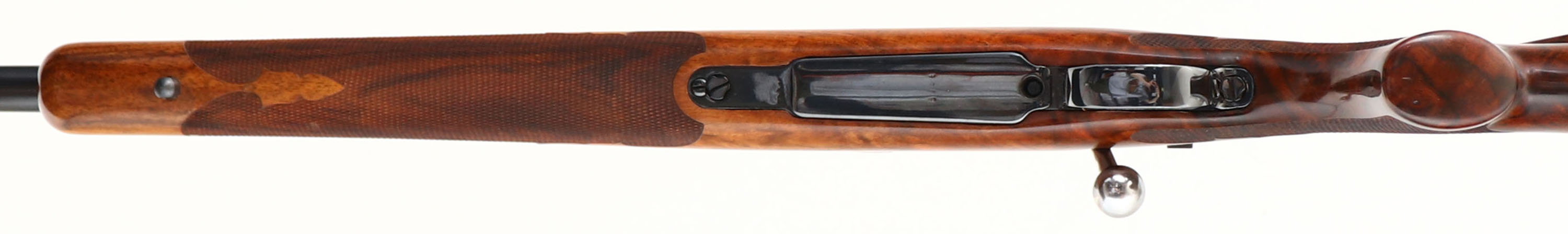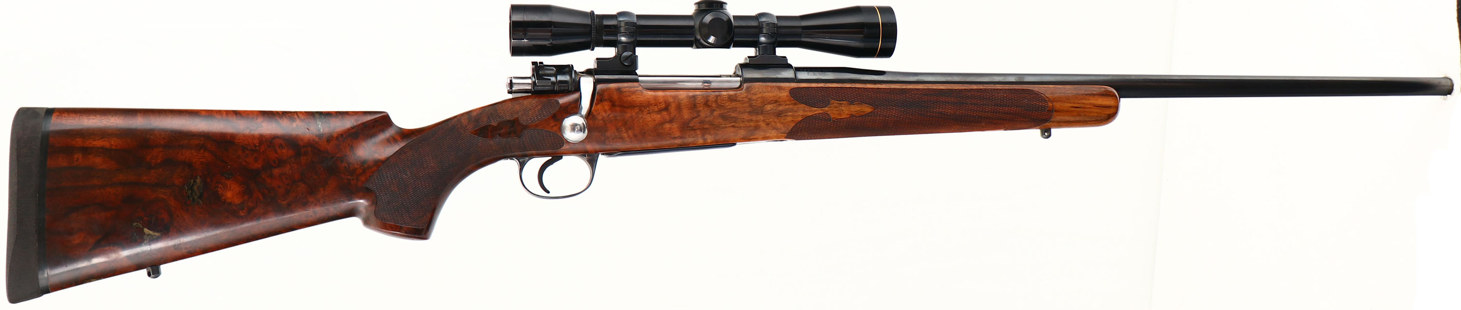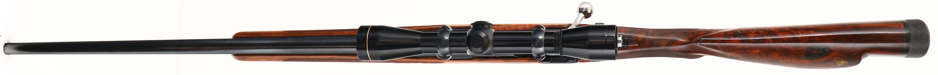 Custom Rifle, Built in the H&K Gun Shop on a German K98K Action, CAL: 257 Roberts Ack Imp., MFG: 1940's (action), SN: 5768, Bolt Action Rifle, 24 1/2'' Round barrel. A fantastic custom built rifle utilizing a WWII German Nazi military rifle action, with the Iron Eagle stamped on the left side of the receiver collar. The custom checkered, cheeked & flat pistol grip walnut stock is excellent, with excellent finish. Beautiful birds eye grain & extra fine hand checkering. The stock shows epoxy filled natural grain pockets mostly to the sides of the stock. The metal blue finish rates 95% overall. Bore is excellent. The receiver holds a Leupold Gold Ring M8-6X scope, while the barrel carries open sight provisions. Stock carries a solid rubber recoil pad. Sling studs. Excellent overall. FFL or C&R Req. - Value: 500 to 1000
