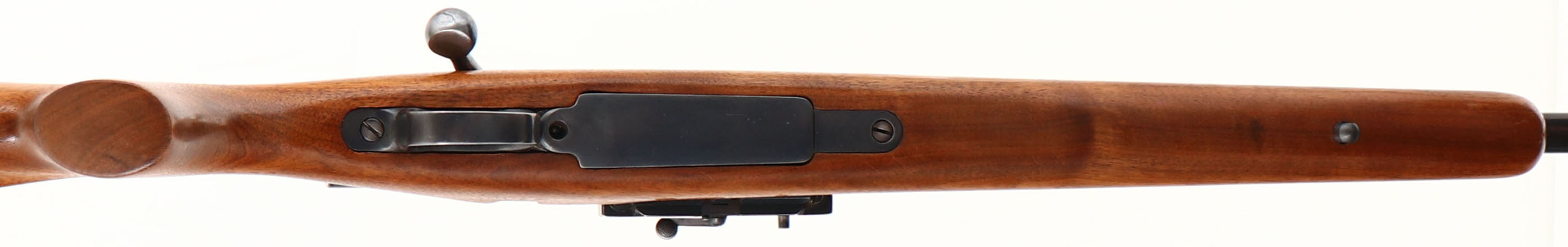 Sporterized Rifle, Built from a Remington 03-A3 Action, CAL: 30-06, MFG: 1942 (action), SN: 3443630, Bolt Action Rifle, 22'' Round barrel. WWII rifle & a first year production 03-A3 rifle. The upgraded cheeked & flat pistol grip wood stock is excellent, with few minor contusions the stock's original finish. The metal blue finish rates 75% overall. The barrel appears to be the original, having been shortened & with the front sight removed. No original receiver sight, as receiver now carries a Weaver K4 60-B scope mounted on side detachable Paul Jaeger mount. Bore is excellent. Stock carries a sold Kickeez recoil pad. Bolt handle has been altered to a swept back position. Sling studs. An excellent sporterized or custom military to hunter conversion. FFL or C&R Req. - Value: 300 to 600