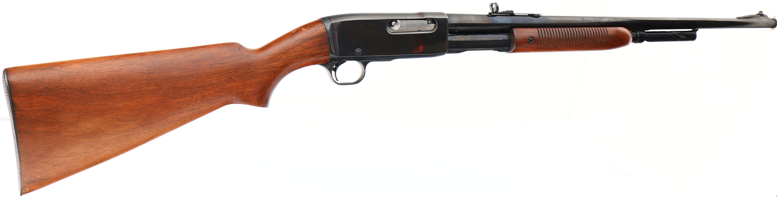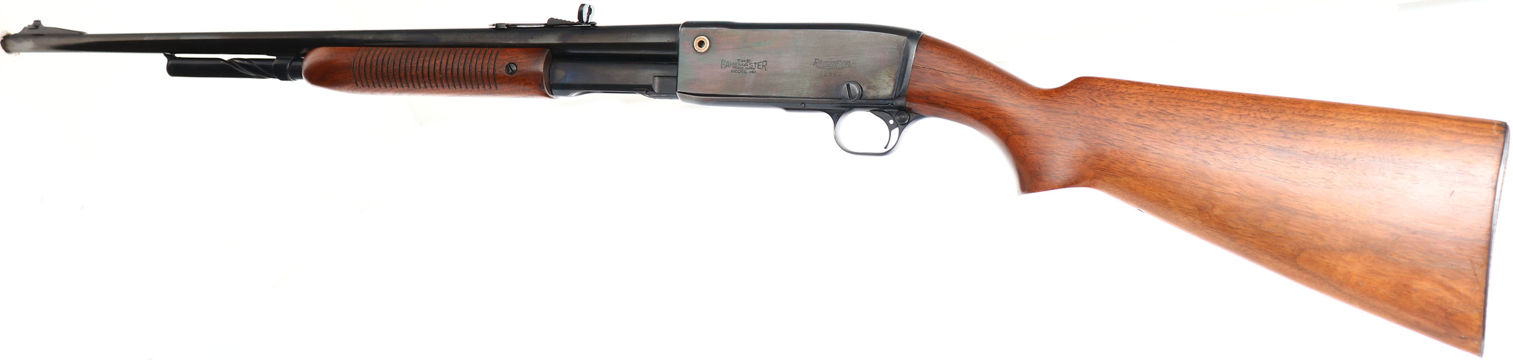 Remington, Model 141 Gamemaster, .30 REM Cal., MFG. 1938, SN: 22884, Pump Auction Rifle, 24'' round barrel, The original flat pistol grip wood stocks are good & solid, despite a 3'' stress crack on each side of the wrist at the receiver. The stocks have been lightly sanded & nicely refinished, with very few light handling marks remaining. The metal blue has been refinished, rating 98% overall, but with a front section of the receiver being a shade darker. Bore is excellent. Fitted with a Marble's full buckhorn rear & ramped blade front sight. Remington checkered metal buttplate. Action is tight & functions well. Rifle has an excellent restored appearance. FFL or C&R Req. - Value: 400 to 800