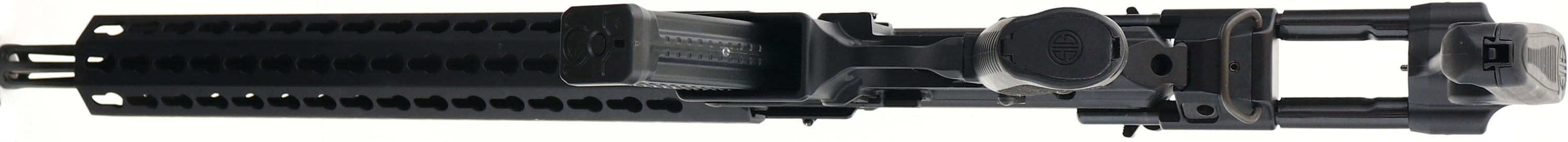 Sig Sauer, MPX PCC, CAL: 9mm, MFG: Modern, SN: 62B029141, Semi Auto Carbine, 16'' barrel. The synthetic textured grip is excellent. The hard coat anodized matte black finish on the upper & lower rates 99% overall. Bore is excellent. Flip-up sights. Full length upper picatinny rail for optics & key mod forend for accessories. 5-position telescoping stock. Comes in a Fieldline soft case, with paperwork, (5) mags, extra parts & lock/key. FFL Req. - Value: 1500 to 2200