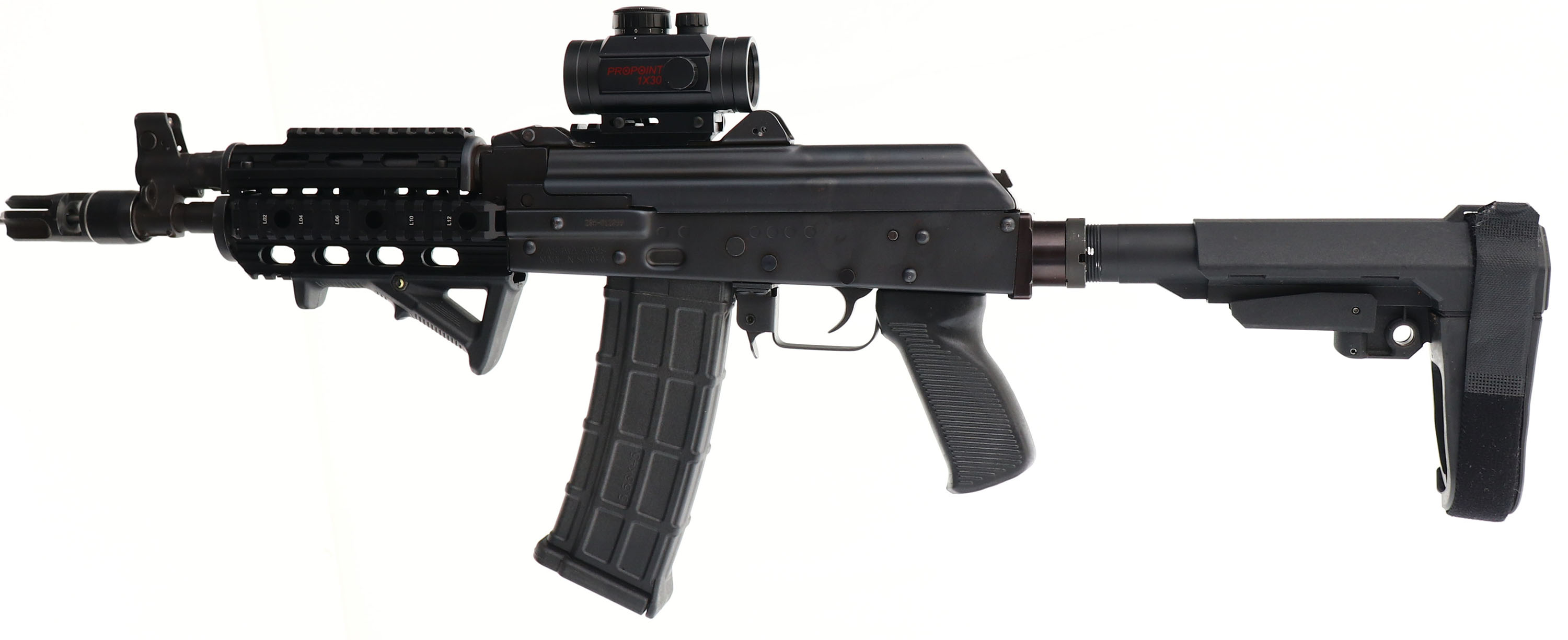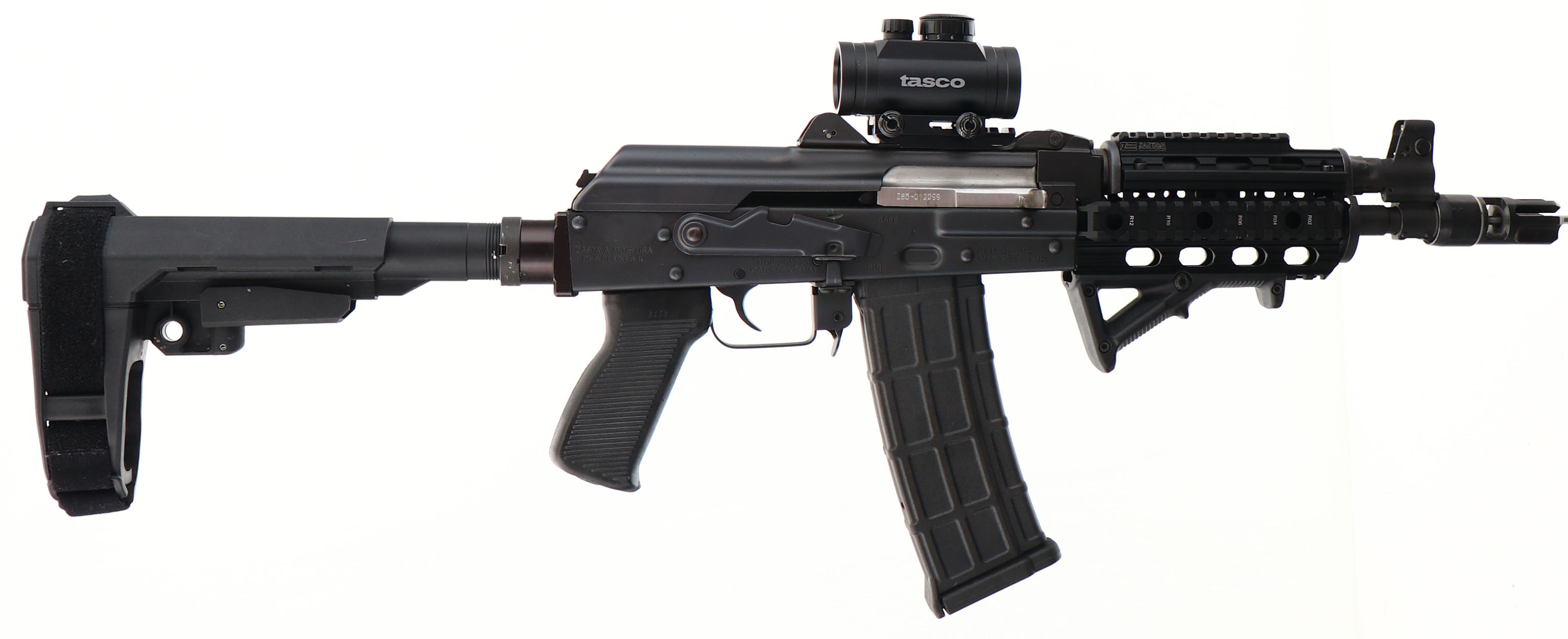 Zastava, ZPAP-85, CAL: 5.56, MFG: Modern, SN: Z85-012099, Semi Auto, 11'' barrel. The 5-pt adjustable arm brace, grooved synthetic grip & forend grip are all excellent. The matte black finish on the receiver & AK-74 dust cover rates 97%, with minor spotting toned to a brown patina. Bore is excellent. Factory iron sights. Receiver picatinny holds a ProPoint 1x30 red dot. Quad-picatinny forend for accessories. Comes with a quick detach AK style sling. FFL Req. - Value: 900 to 1400