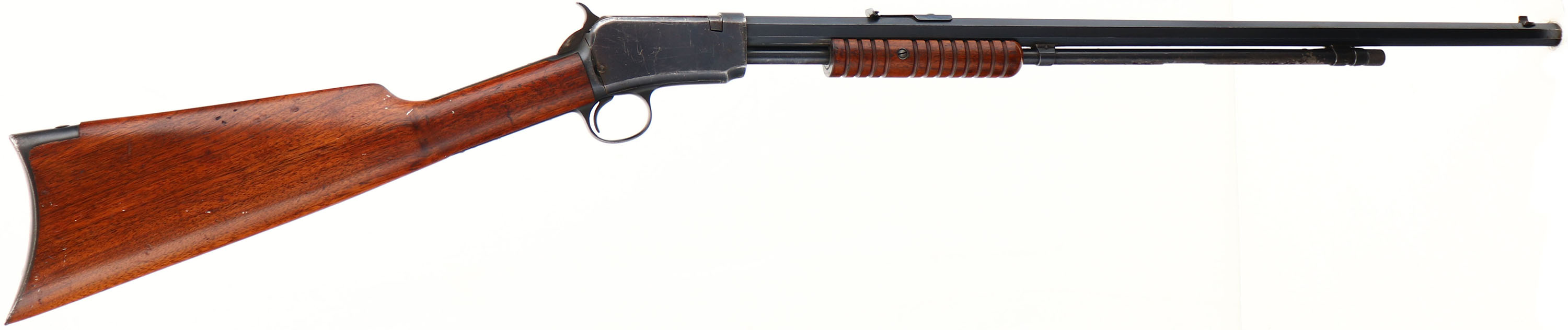 Winchester, Model 90, Third Variation, CAL: 22 WRF, MFG: 1920, SN: 659341, Pump Action Rifle, 24'' Octagon barrel. The original straight grip wood stock & corncob forend are excellent & solid. There is some light white paint speckling on the right side of the stock to the original finish. The stocks show some additional thinning & minor scratches or contusions. The original metal blue finish rates 80% on barrel, with some light speckling & spotting on the left side. Bluing rates 70% on the receiver & 50% on the mag tube. Bore is good, but with spotty areas of cleaned rust pitting or scarring. The barrel holds a standard rear & front sights. Buttstock carries a smooth crescent metal buttplate. Tight smooth action. A nice original example in the WRF caliber. FFL or C&R Req. - Value: 1400 to 2200