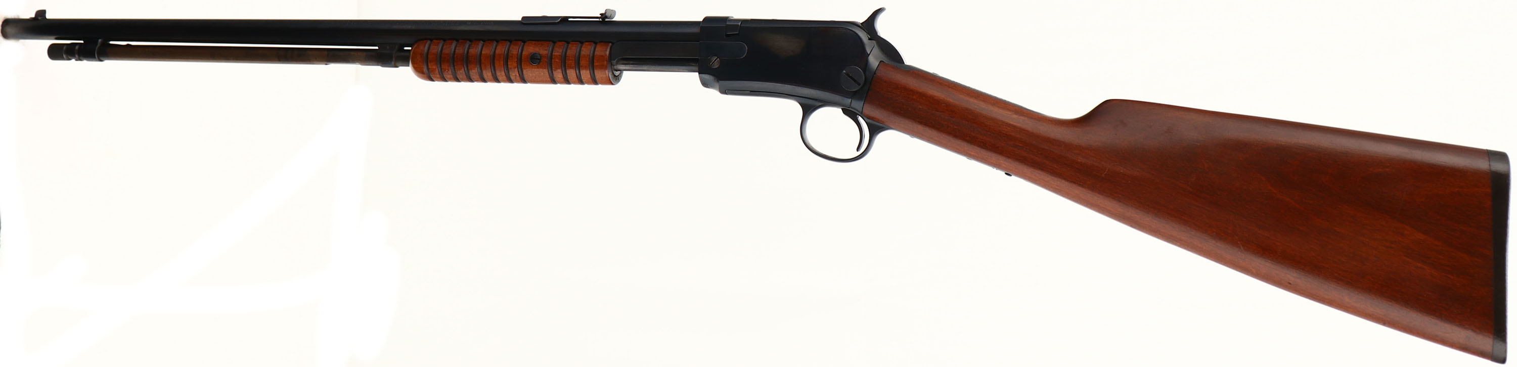 Winchester, Model 1906 , .22 S. L. LR., MFG: 1919, SN: 591898, Pump Action Rifle, 20'' Round barrel, The original straight grip gum wood stocks are excellent, with nearly all the original finish & virtually no rubs or handling marks except a shallow 1/2'' contusion in the middle right side of stock. The forend is of the grooved 1890 variety. The original metal blue finish on the barrel & receiver rates 98%, 50% on mag tube due to flaking loss. Bore is excellent. Fitted with standard barrel sights. Winchester plastic buttplate, with engraved screws. An original, overall excellent condition & collectible example. FFL or C&R Req. - Value: 2500 to 3500